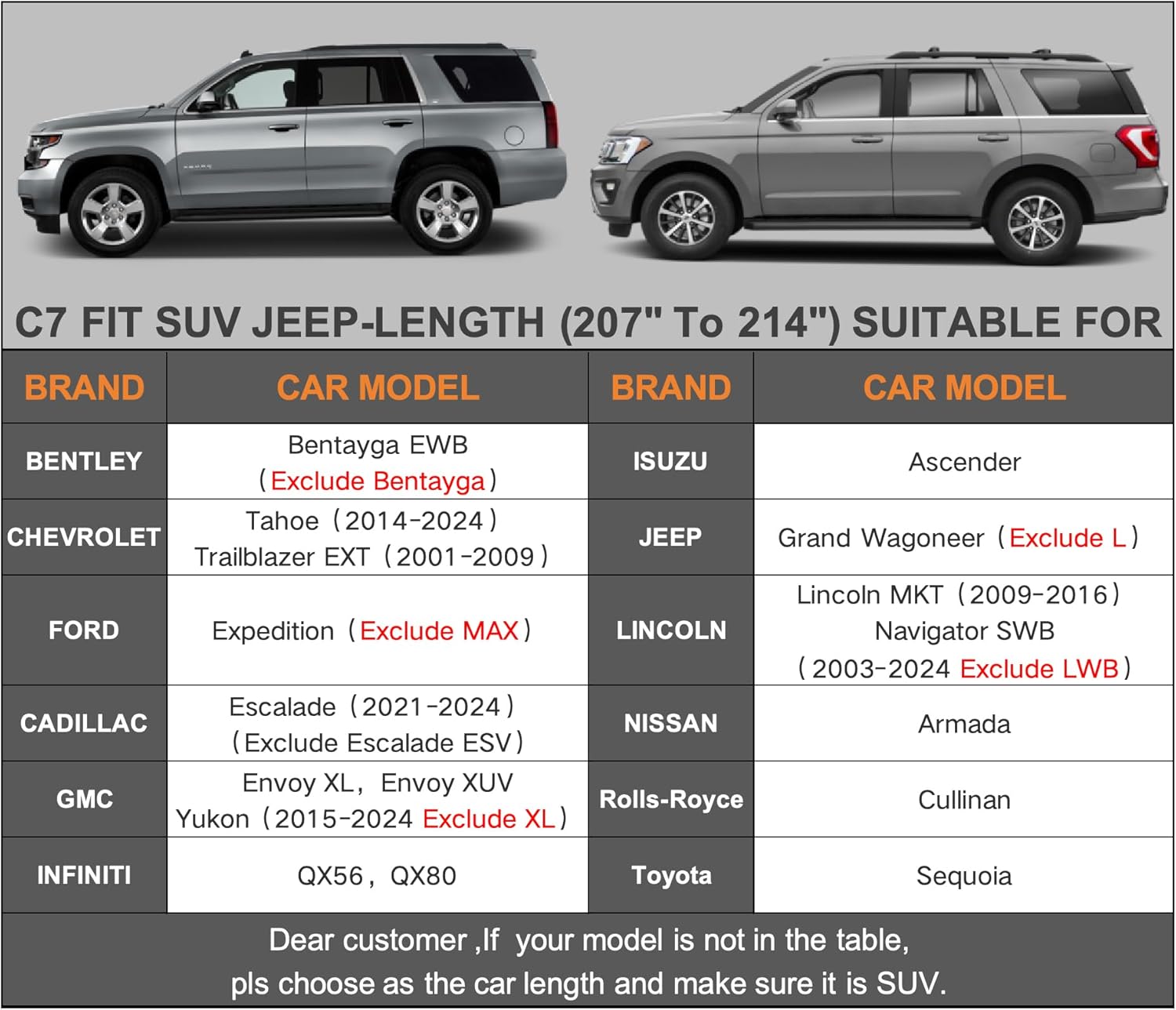 - ăDimension C7ăUniversal fit for Suv which length is 207-214 inch (Not for hatchback and sedan). Suitable forInfiniti QX56 QX80, Ford Expedition, Nissan Armada, Toyota Sequoia etc.