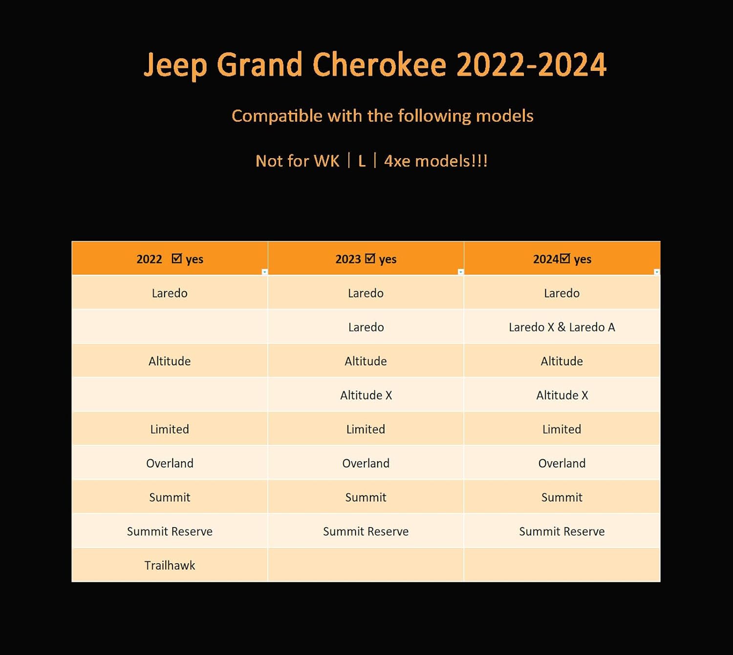 - ăFit like a gloveăCustom fit for Jeep Grand Cherokee 2022-2024. Binmotor auto floor mats are accurately scanned by professional 3D laser scanner to make the car floor mats and the original car data accurately match. What's more, details such as throttle and brake were noted during the design process, which will not affect you when you drive.