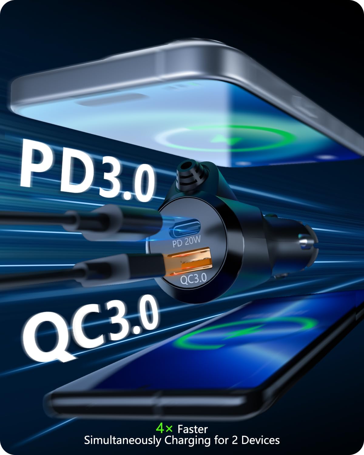 - Intelligent and Fast Charging: Dual USB ports design can intelligently identify iPhone devices or other smart devices. The Type-C port can offer 20W fast charging speed, another QC port can provide 18W, allows you to charge two devices at once. The car bluetooth adapter is 4X faster than standard chargers, you could charger your lastest iphone, ipad, cellphones, tablets at full speed