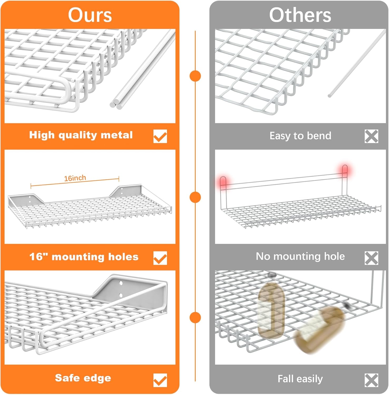 - Safe Edge: Wall mounted shelving has safe and no sharp edges, it is very important that nothing will slide off the shelf.
