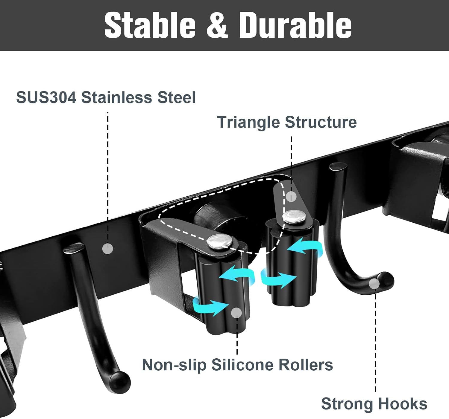 - 【Strongest Hold & Non-slip Design】 The mop and broom holder wall mount is made of 304 stainless steel, more durable than plastic materials, holds items up to 40 lbs .