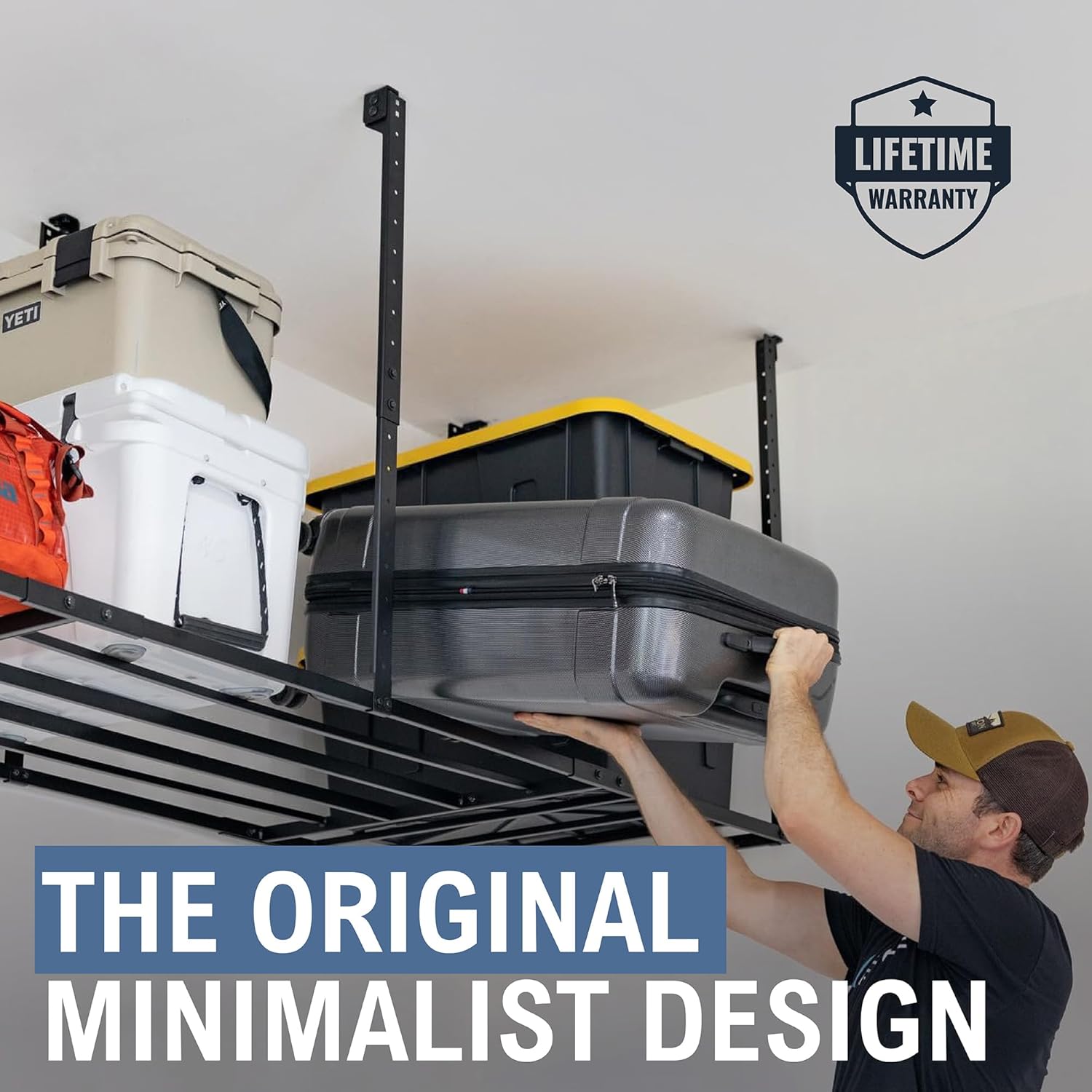 - Safely Stores 700 Pounds: Solid alloy steel frame supports up to 700 lbs for secure garage overhead storage. A flat, square tubing shelf provides more stability than traditional wire shelves.