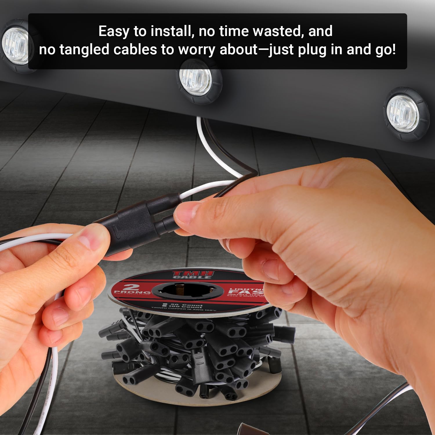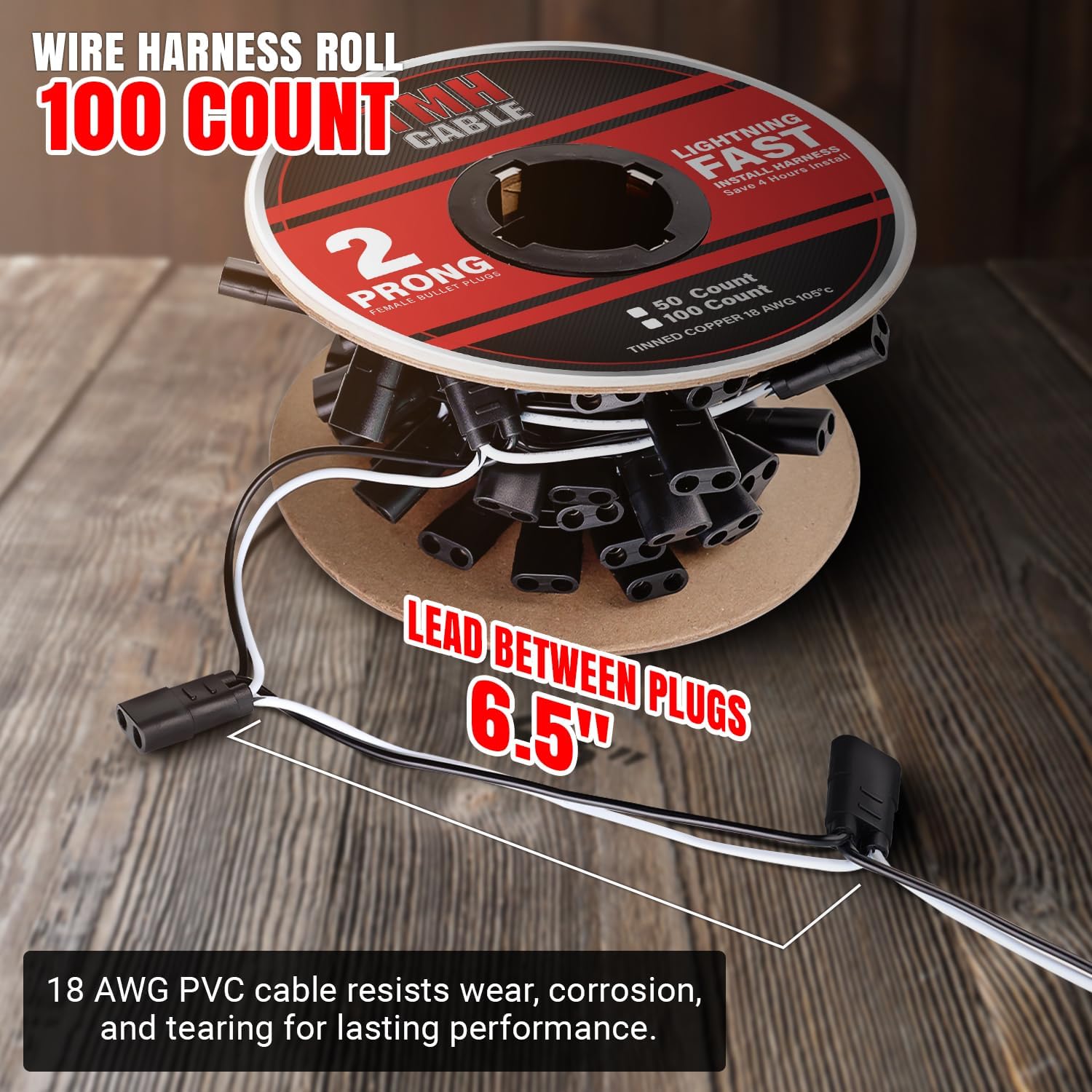 TMH 100 Count 2-Prong Wire Harness Roll Double Female Bullet Plug 18 Gauge - 6.5" Spacing for LED Marker Clearance Lights Hassle-Free Installation