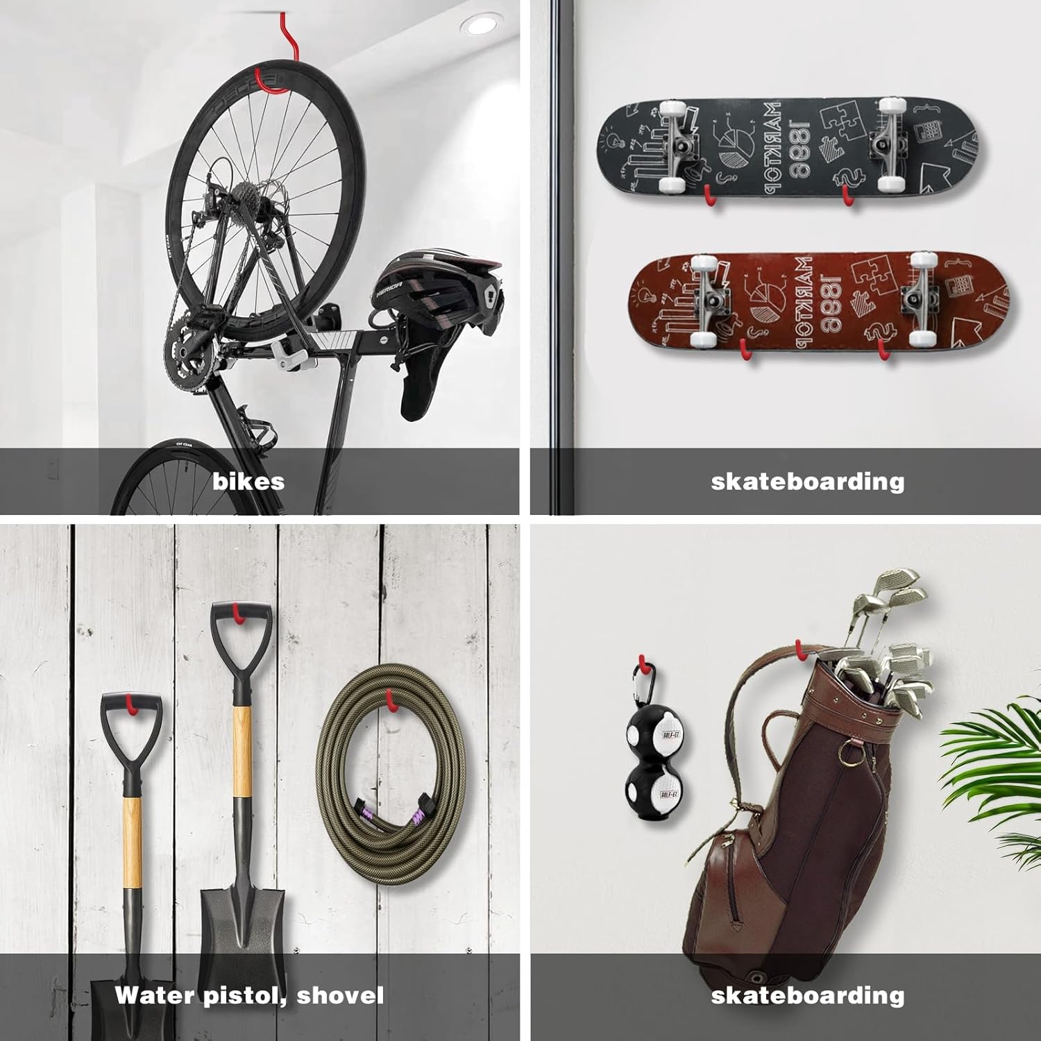 - 【Multi-functional Hook】Commonly used for hanging bicycles, garden water pipes, plants, skateboards, golf sets, shovels, agricultural shovels, fishing rods and other large tools on walls, ceilings, and wooden boards.