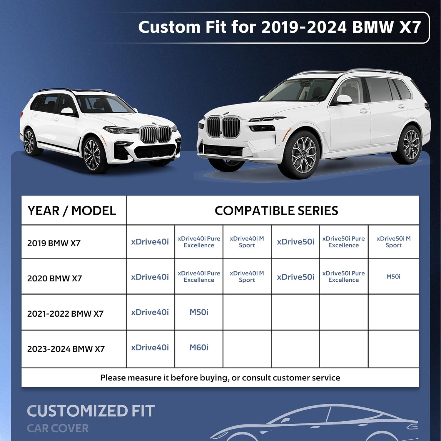 - ăPerfect Fităâ Holthly has conducted experiments to obtain a customized car cover specifically designed for BMW X7 (2018-2024). The custom-like fit of the full cover not only enhances the -aesthetics of your vehicle but also provides superior wind resistance, thereby prolonging the lifespan of the hood. It offers enhanced and long-lasting protection for your car.