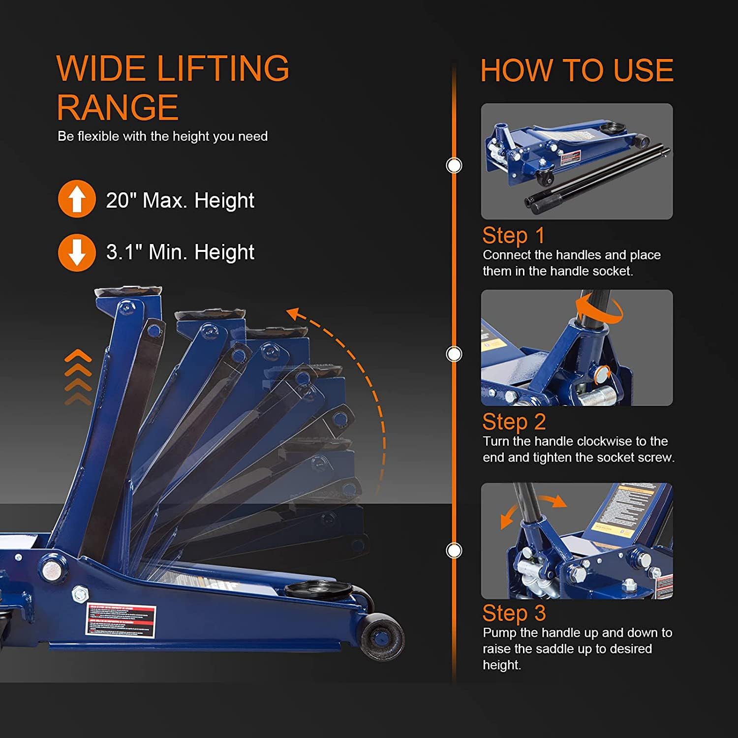 - WIDELY USED - Well made low profile 3 ton floor jacks are suitable for a variety of vehicles, like cars, light trucks and SUVs, easy to assemble and use at garage, roadside or anywhere else. Lifting range from 3-1/8" to 20" ,which allows you to gain easy access under low-profile vehicles