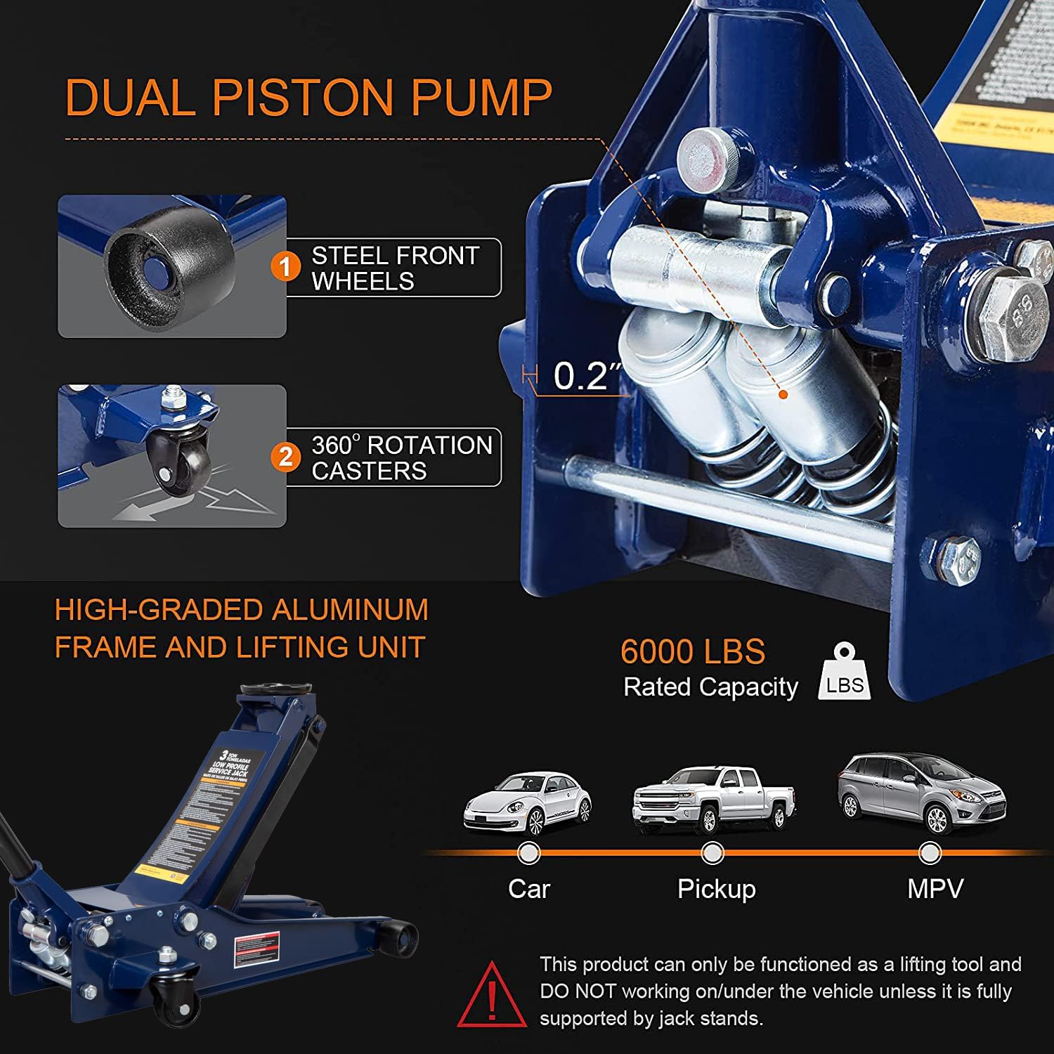 - MATERIAL: The heavy duty low profile floor jack is constructed with durable heavy duty steel, providing strength and durability to increase service LIFE: Blue paint is not easy to come off or crack.