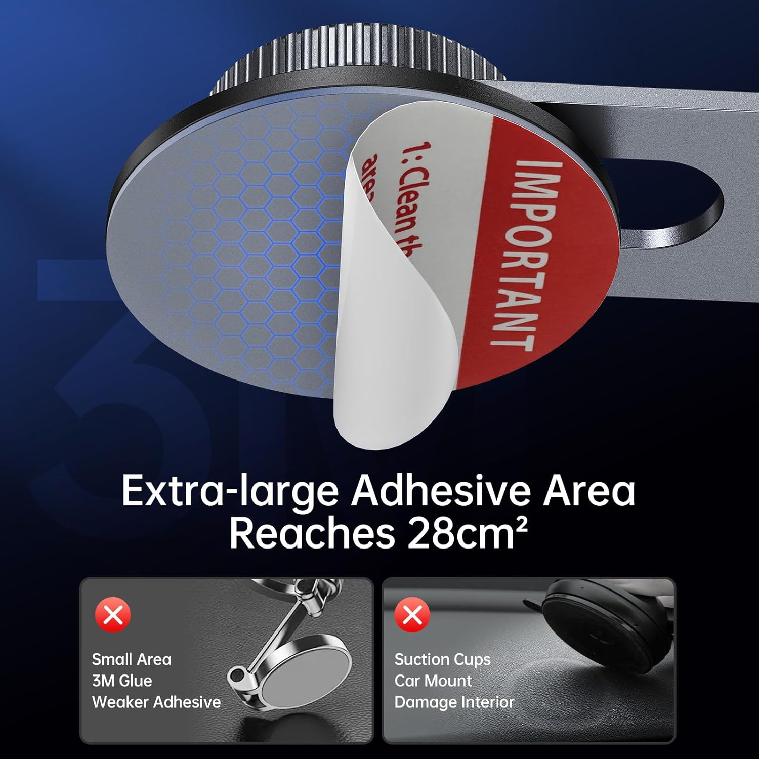 - [Extra-large Adhesive Area] - 3M VHB sticker reaches 28cm², which is 3 times more than other products, making the pasting more stable. It is less likely to damage the interior compared with these traditional suction cup competing products. The traditional suction cups will cause irreversible deformation and damage to the user's dashboard due to vacuum suction.