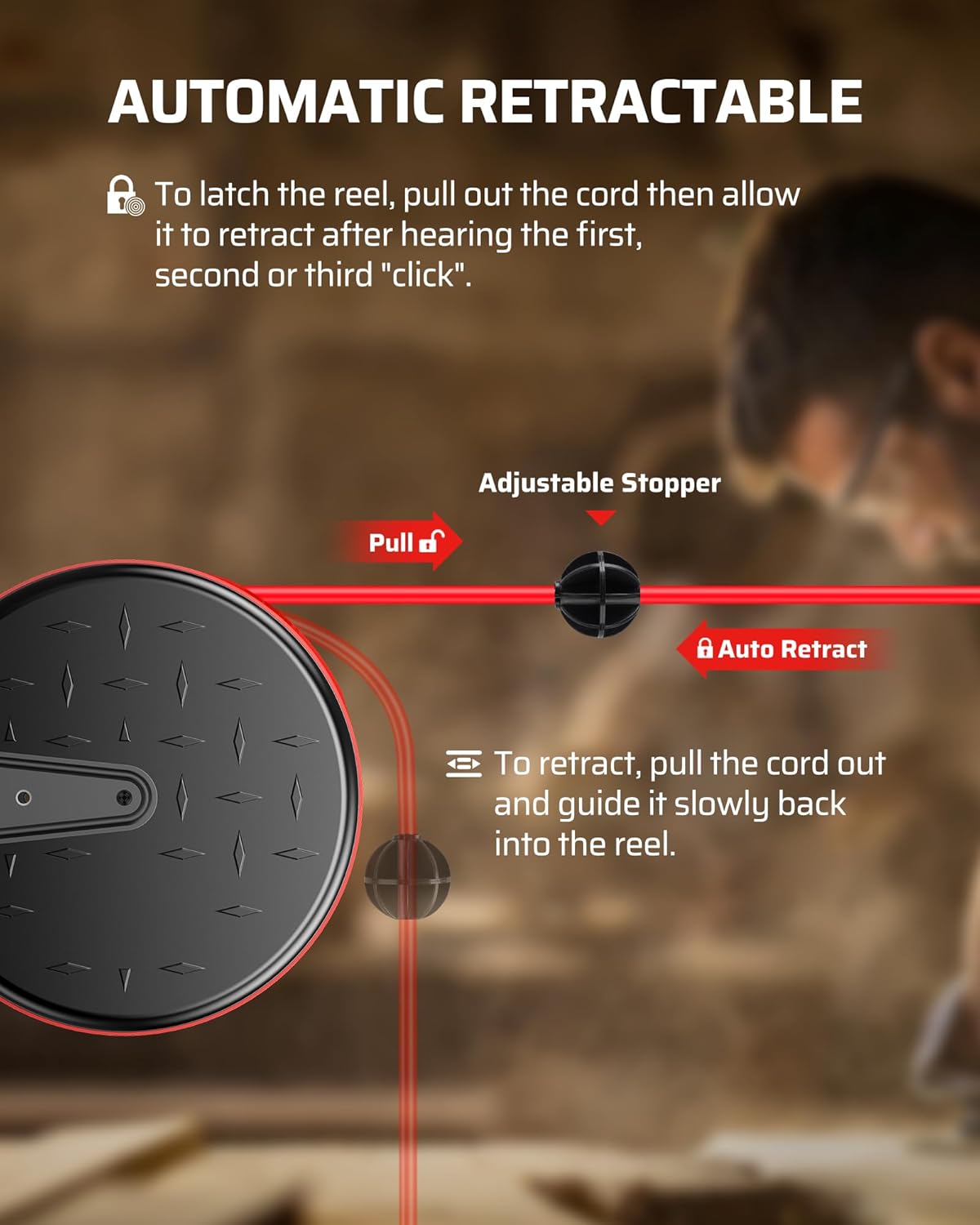 - [Automatic Ratcheting System] With a clever auto-guide rewind mechanism to avoid kinks and tangles, the SJTW extension cord winder will retract quickly and smoothly, also comes with a flexible stopper to adjust the length of cord and prevent the retractor from getting stuck in slot, lock the cord at any length