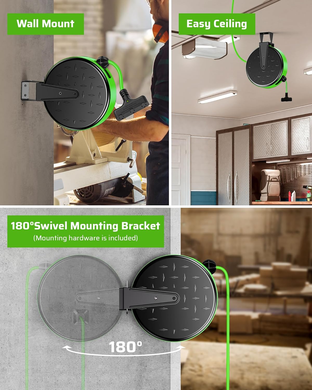 - [Ceiling/Wall Mount with 180° Swivel Bracket] The swivel mounting bracket lets the extension cord reel swivel freely up to 180 degrees; perfect for hanging from your garage ceiling or mounting to a wall; easy to pull and release cord, freeing up more workspace and make storage a breeze; avoid tangled cords or people tripping up