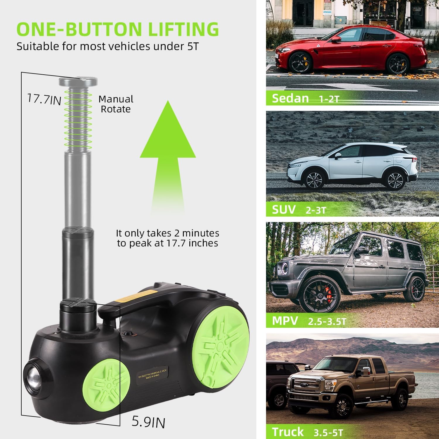 - One-Touch Operation: Saving time and effort greatly, instant control system of elelctric jack for car completes car lifting in just 2 minutes, significantly boosting efficiency compared to traditional manual jacks