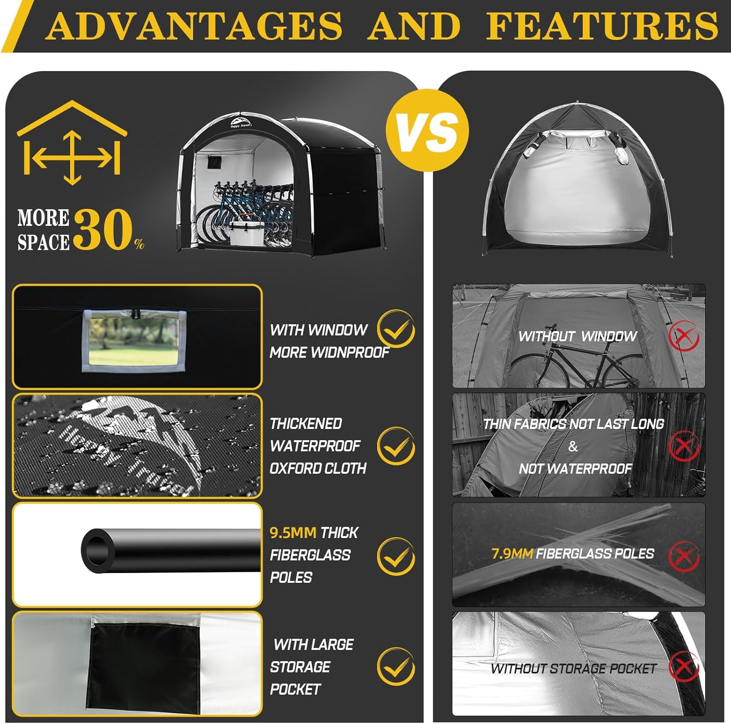 - ăSpacious Vertical Storage Shedsă:We have adopted a new vertical design, which gives the bicycle storage shed 30% more storage space than similar semi-circular products which allows you to have more storage space.Our sheds & outdoor storage has been upgraded to a new size, the size of backyard storage reaches 7.3*5*6.2ft.It can accommodate 4 bikes or 2 motorcycles at the same time.