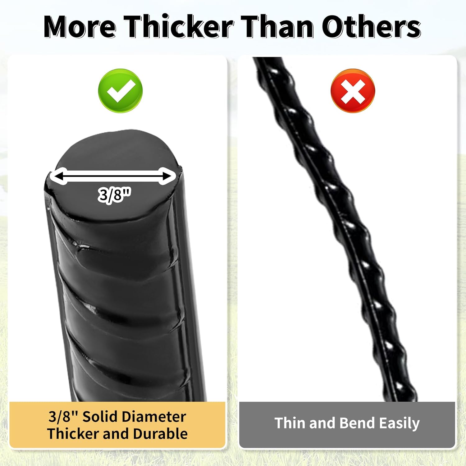 - 【MULTIPLE PURPOSES】Metal stakes are sturdy and reusable, widely used in garden, yard and outdoor camping. Use them as heavy duty tent anchors, shepherd's hooks, stakes for inflatables, chain link fence ground anchors, trap anchors, landscape spikes, cage anchors, trampoline stakes etc