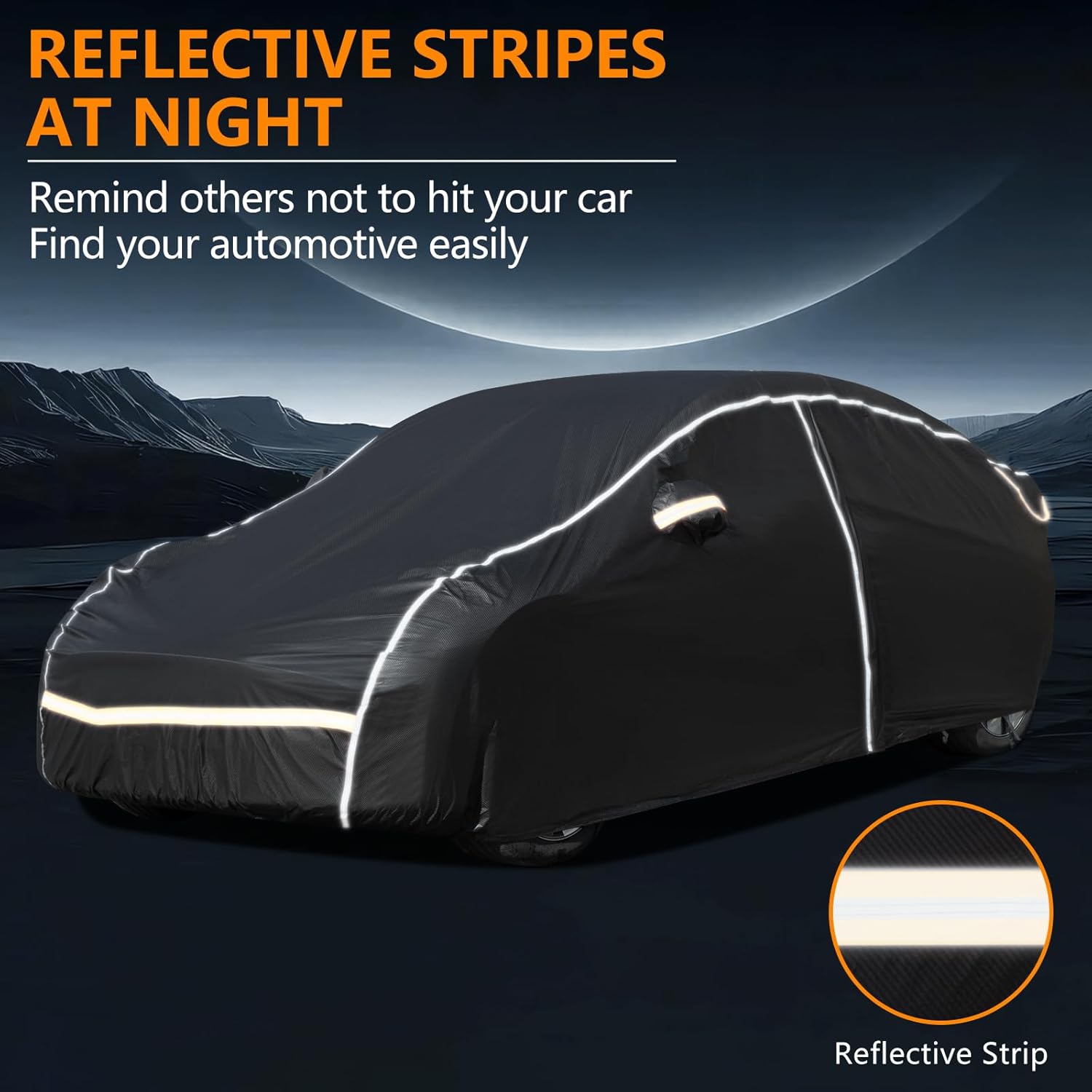 - Complete Protection: The cover with four wind stripes can completely cover and stick to the car body to avoid being easily blown away by the wind. Then the reflective strips provide night visibility, and your car's contour can be easily seen and avoid accidents. No matter what happens, Our full exterior car covers can handle it all