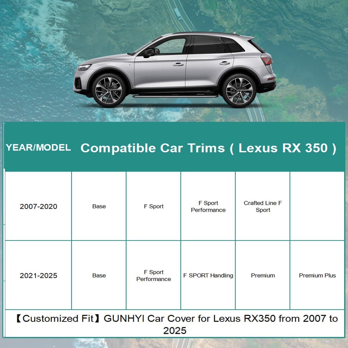 - ăCompatible withăThis Full Car Cover Custom fit for Lexus RX350 from 2015 to 2025. Comes with a microfiber towel that you can use to clean your car, because if there is sand on the surface of the car before use, it may damage the paint.