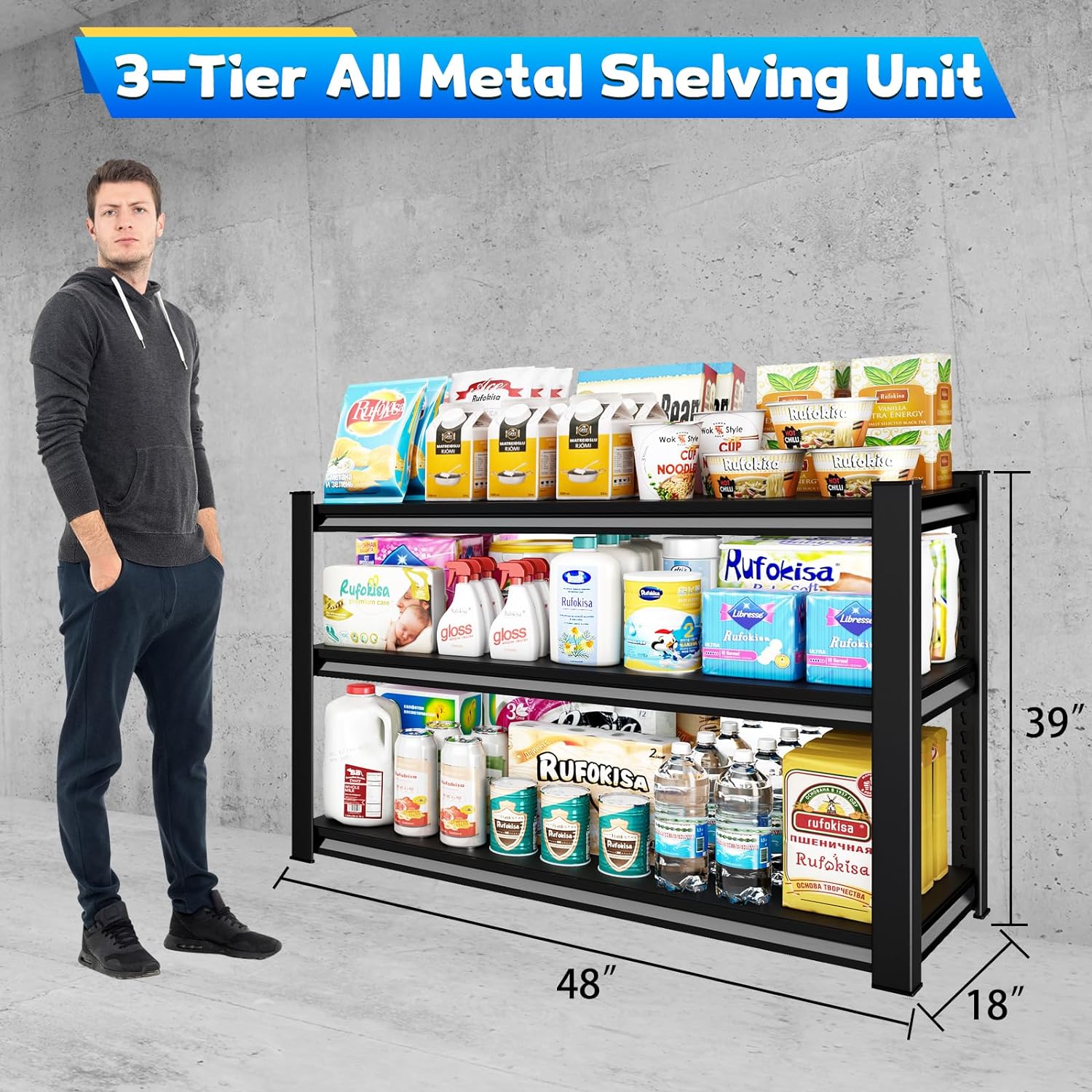 - 【Large Size Storage Shelves】Rufokisa 3-tier metal shelving unit with size of 48"W*18"D*39"H,which provides sufficient storage space and holds tons of items. It will works perfect for your garages, warehouses, basements,kitchens, pantry, basement etc .