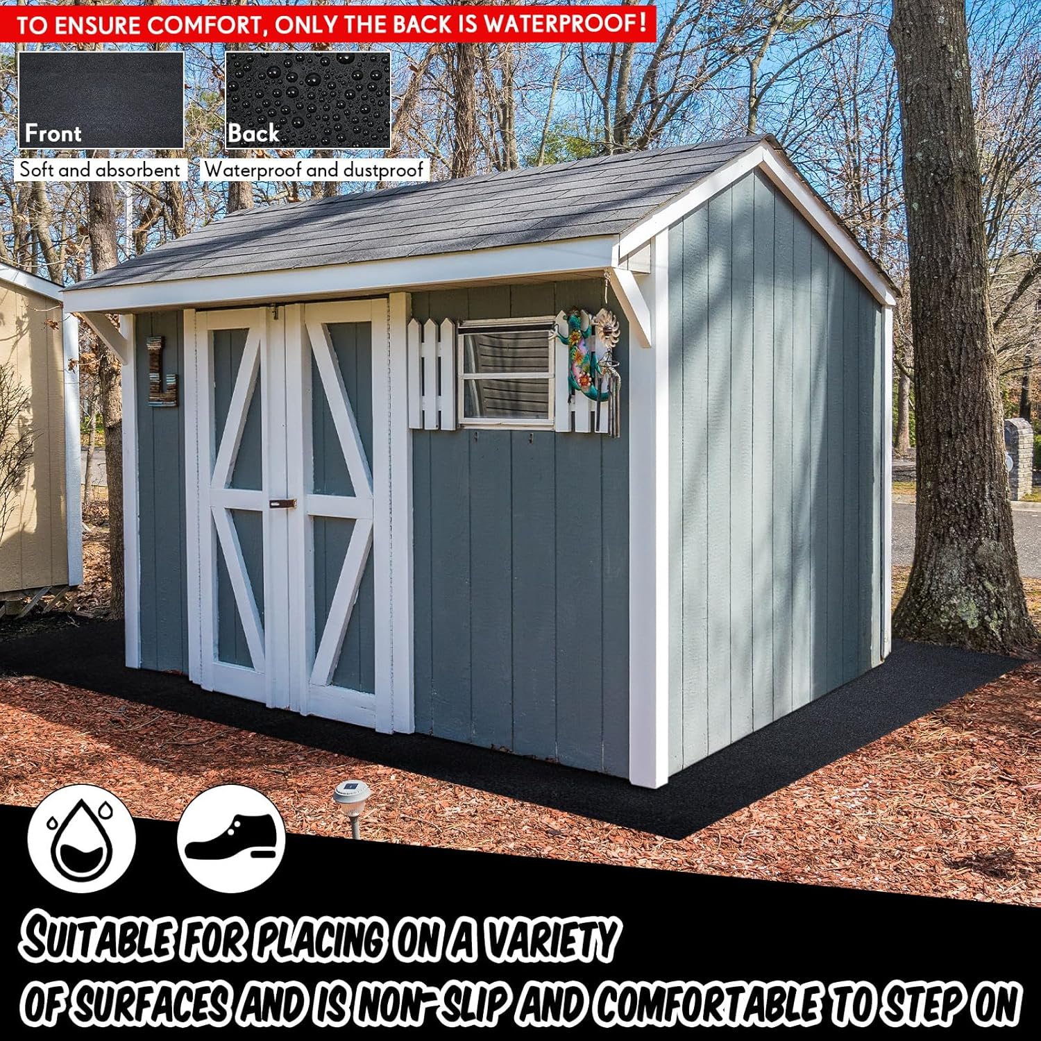 - Easy to Install: the outdoor storage shed mat is simple to use, you just need to unfold the mat and place it flat under the outdoor storage shed floor, which can protect your outdoor storage shed floor from wearing and tearing; Non slip backing remains on the floor for added cushioning, and you can also cut it into proper size to meet your needs