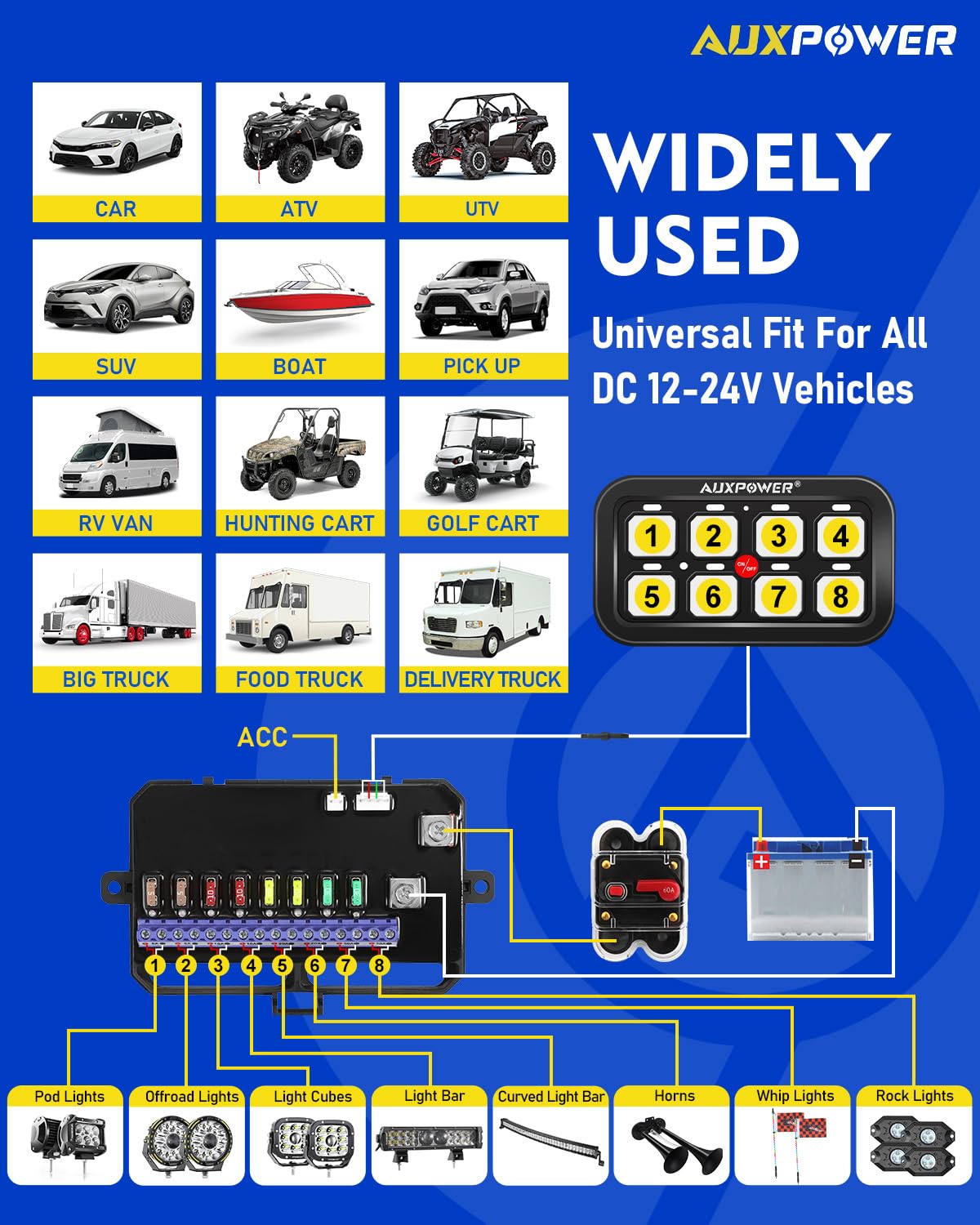 - WIDE USE: Fog lamp switch panel bluetooth are suitable for most vehicles, such as trucks, boats, off-road vehicles, cars, buses, RVs, ATVs, UTVs, SUVs, etc. The AUXPOWER switch panel is the optimal choice for organizing and controlling your car accessories. If you have any problems, please do not hesitate to contact us.