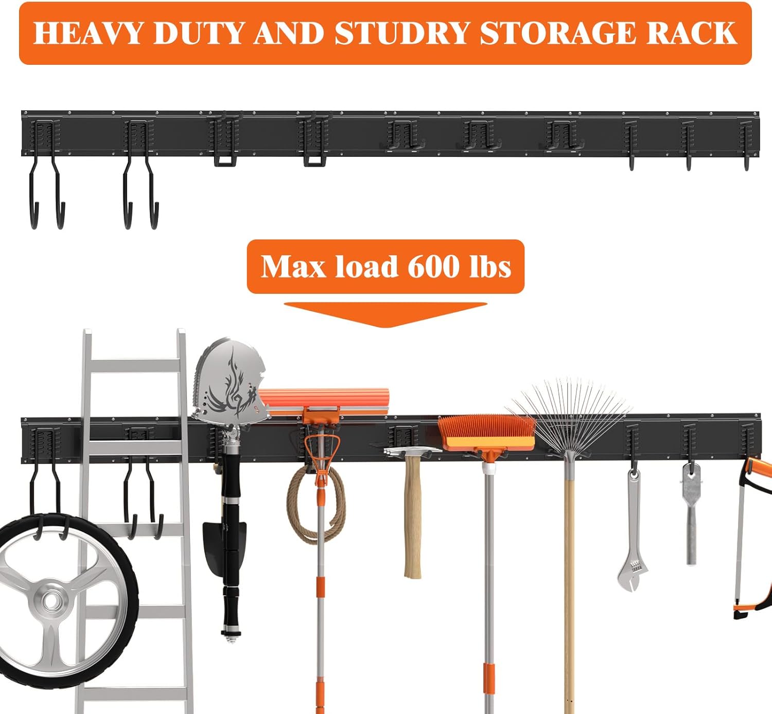 - Heavy Duty & Durable& Max 600lbs: Our wall mounted garden tool rack storage is made of high-strength steel with powder-coated for sturdy and strong organization. Resists rusting, chipping and cracking. It durable enough to hang up to 600 lbs. Rack is 6X stronger than a regular shelf. And the hook is wrapped with rubber to prevent tools from slipping, safe and long-term use.