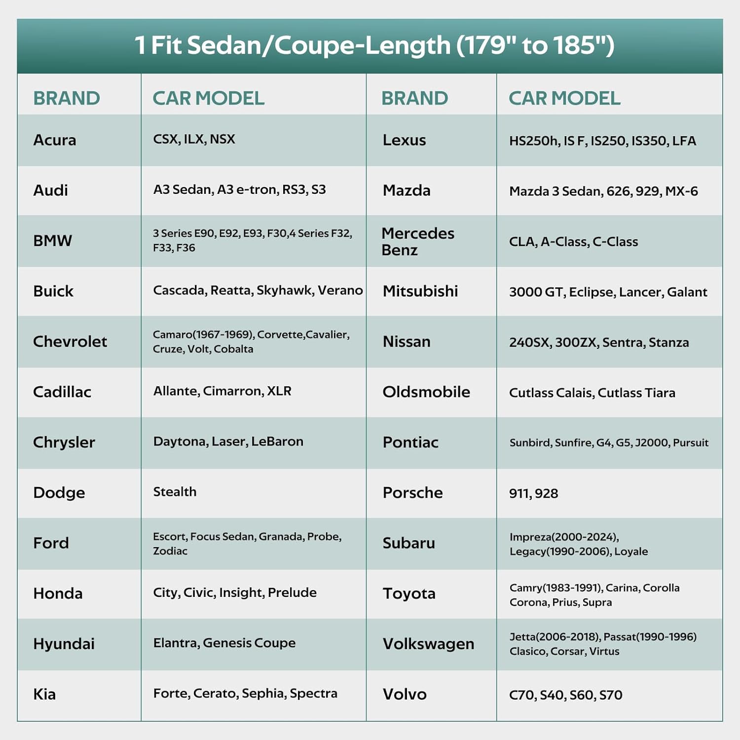 - ăCHOOSE THE RIGHT MODELă: Molebt car cover fits Sedan & coupe 179 to 185 inch. For example Toyota Corolla/Prius, Kia Forte, Nissan Sentra, Hyundai Elantra, Honda Insight, Ford Focus(Sedan), Chevy Cruze/Volt, Volvo S40, VW Jetta, Lexus IS250/300/350, California etc.