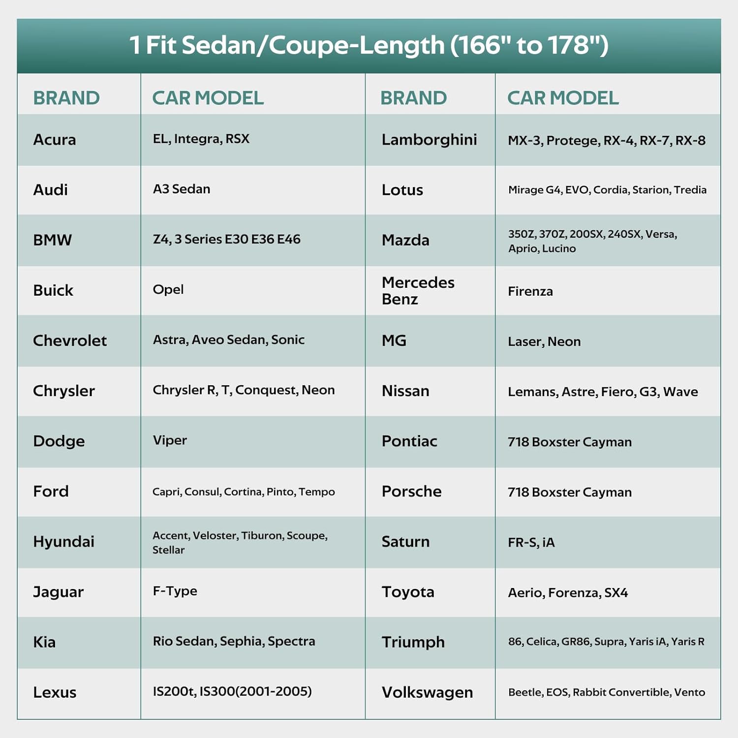 - ăCHOOSE THE RIGHT MODELă: Molebt full car cover fits Sedan & coupe 166 to 178 inch. For example Audi TT, Toyota 86/Supra, Subaru BRZ, BMW Z4, Nissan Versa/240SX/370Z, Hyundai Accent, Nissan Versa, Porsche 718/Boxster/Cayman, Mazda RX-8 etc.