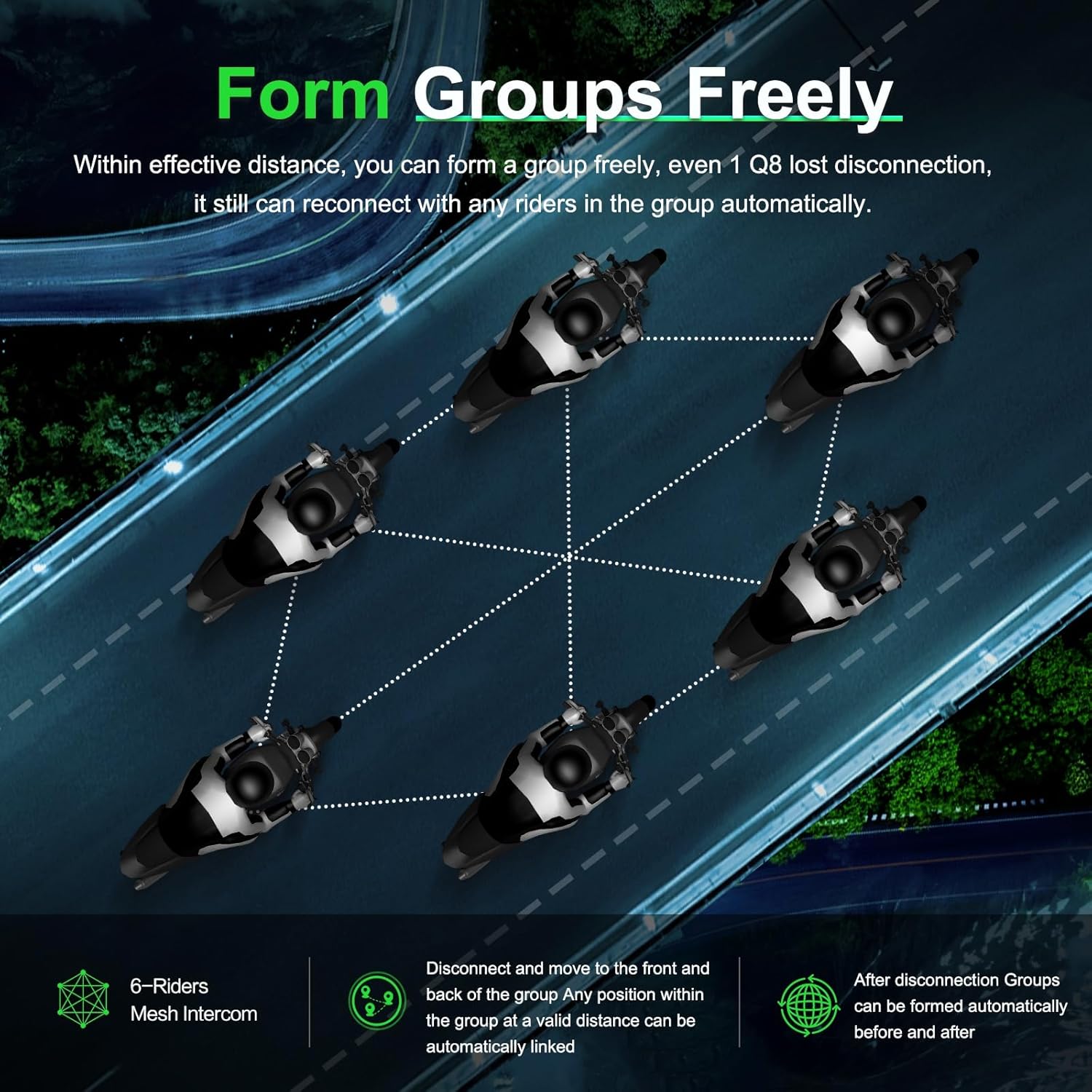 - 【Powerful Mesh Communication Technology】The Q8 supports 6 riders talking at the same time, with an intercom distance of up to 1,000 meters. The Q8 adopts advanced Mesh 3.0 technology. Within the effective range, you can freely form intercom groups and automatically reconnect with neighboring users in the group after disconnection. Compared with other Bluetooth walkie-talkies, it has stronger signal penetration capabilities in environments with obstacles such as tunnels, slopes, and narrow curves. Moreover, the Q8 supports connections with other brands of Bluetooth walkie-talkies on the market.