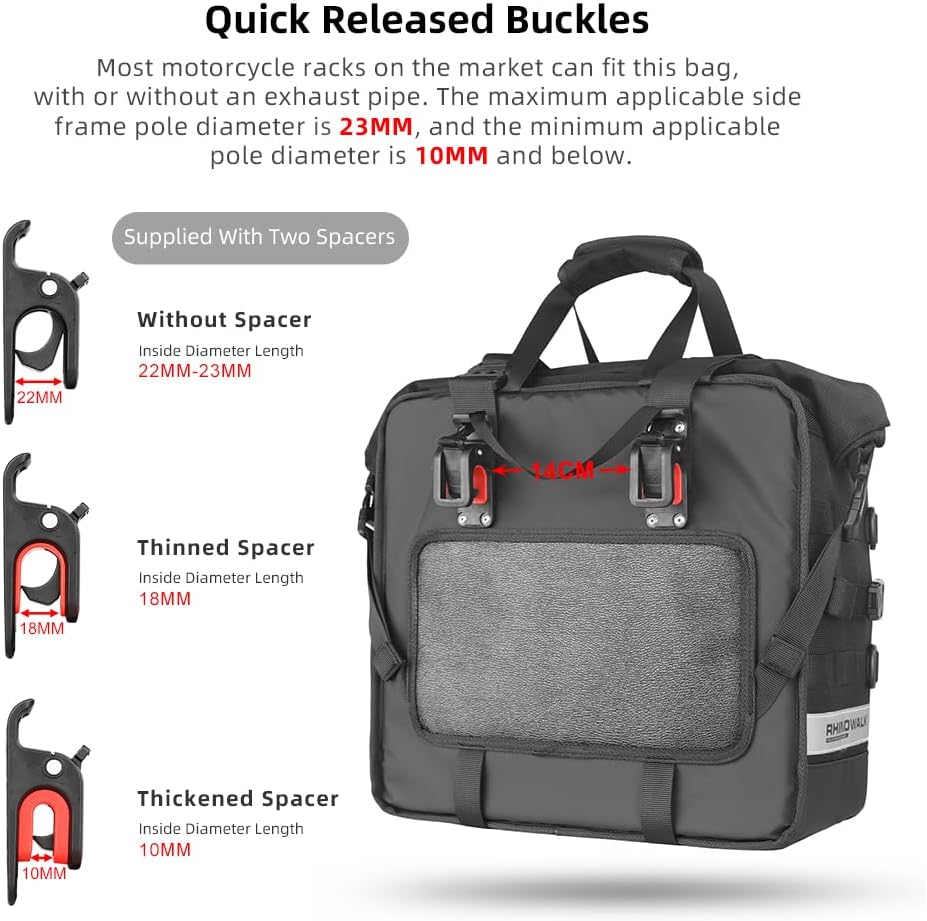 Rhinowalk Motorcycle Saddlebag Waterproof Luggage Bag Quick Release Motorcycle Side Bag 25L Fits Most Adventure and Sports Bike Motorbike Racks (Black, 1 pcs)