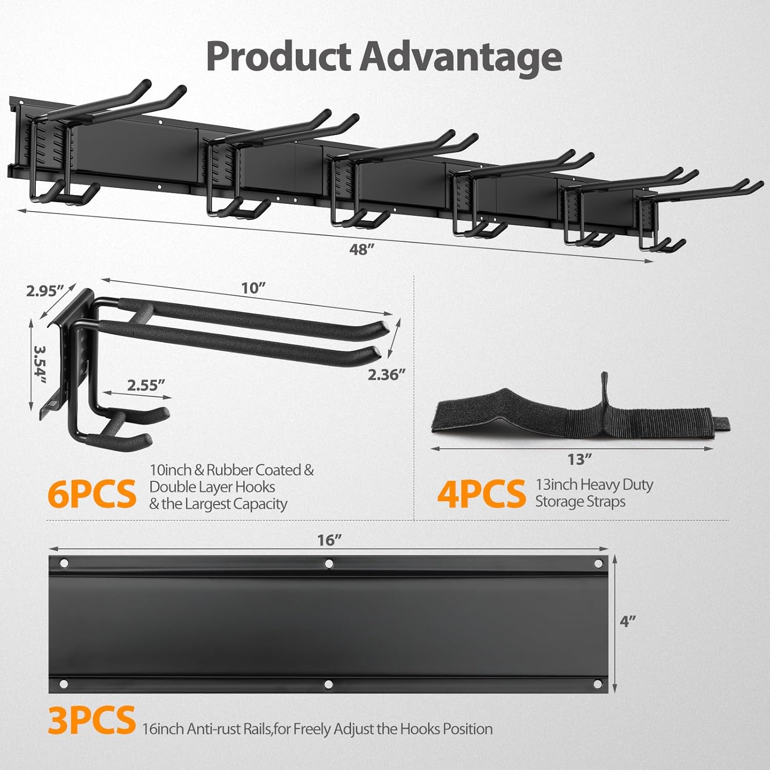 - HEAVY DUTY GARAGE WALL ORGANIZER: Crafted from solid steel and coated with durable black powder, our wall-mounted storage system is built to last a lifetime while preventing rusting. Featuring rubber-coated double long hooks, it offers added protection against slippage and damage, ensuring your tools are securely stored and maintained in top condition.