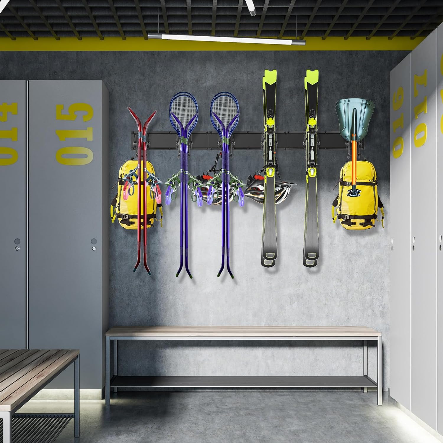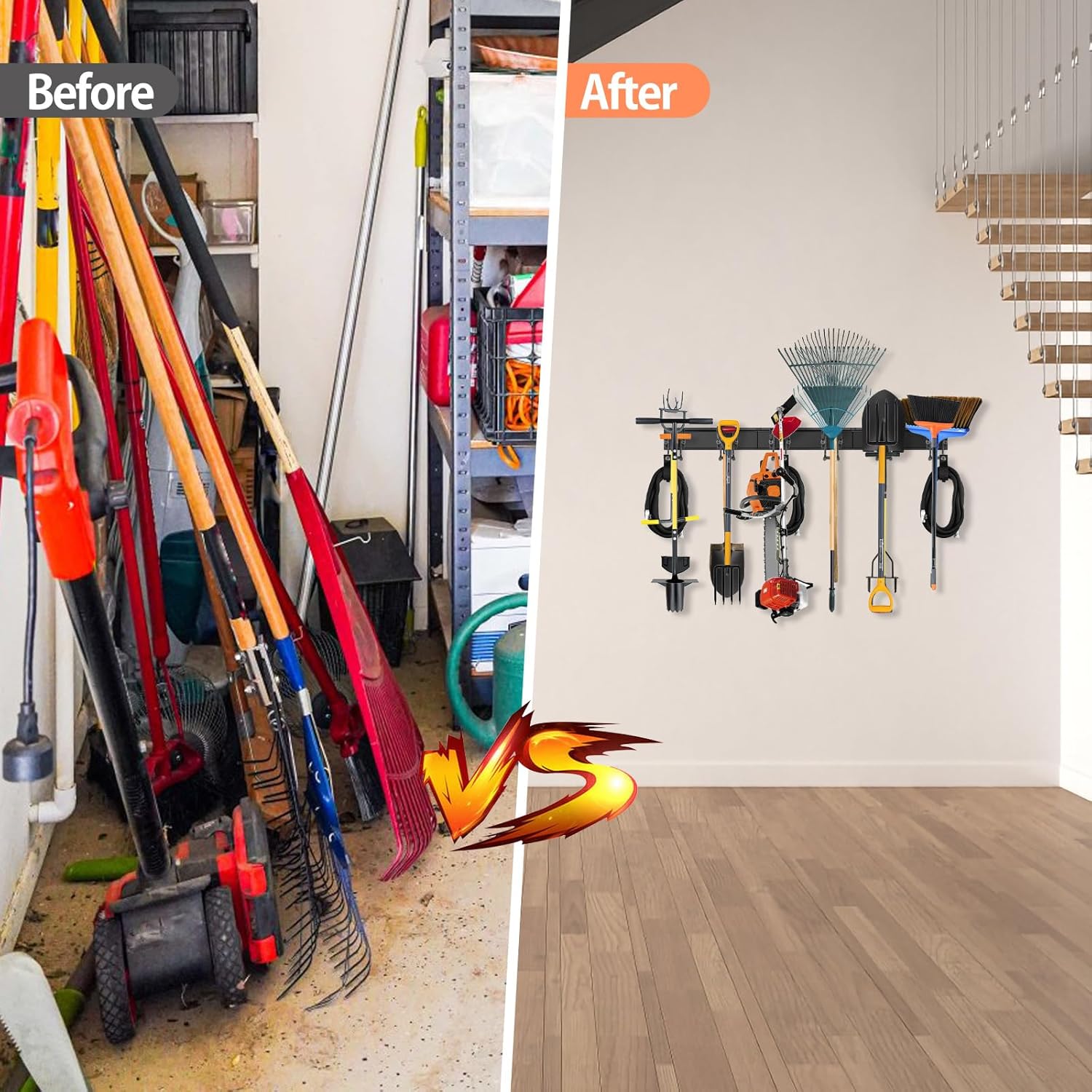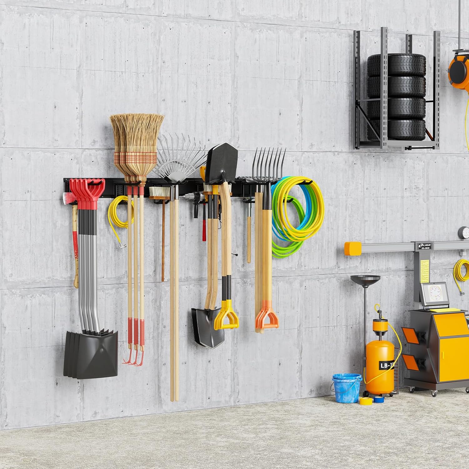 - VERSATILE WALL STORAGE SYSTEM: Our multifunctional tool storage rack accommodates a wide range of items, including garden tools, shovels, rakes, brooms, mops, extension cords, hoses, power tools, chairs, ladders, and sporting equipment. Effectively optimizing your storage space while keeping everything easily accessible and organized.