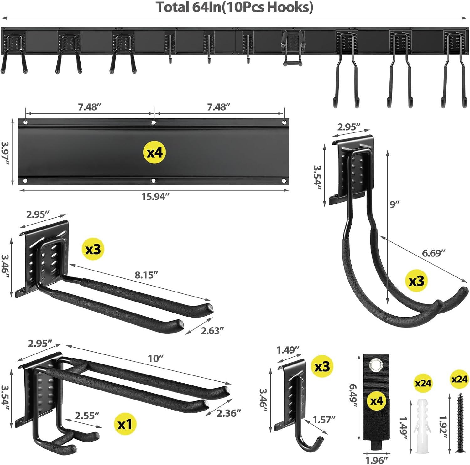 - EASY TO RELOCATER & ADJUSTABLE: The garage wall organizer includes 4 Steel wall racks (16 inch),10 Hooks of various shapes and 4 storage straps. Easily reposition hooks anywhere along the panel tracks to adapt to changing storage needs. Plus, the included storage straps efficiently loop and secure cables, hoses, cords, and ropes, ensuring they're neatly stored and easily accessible.