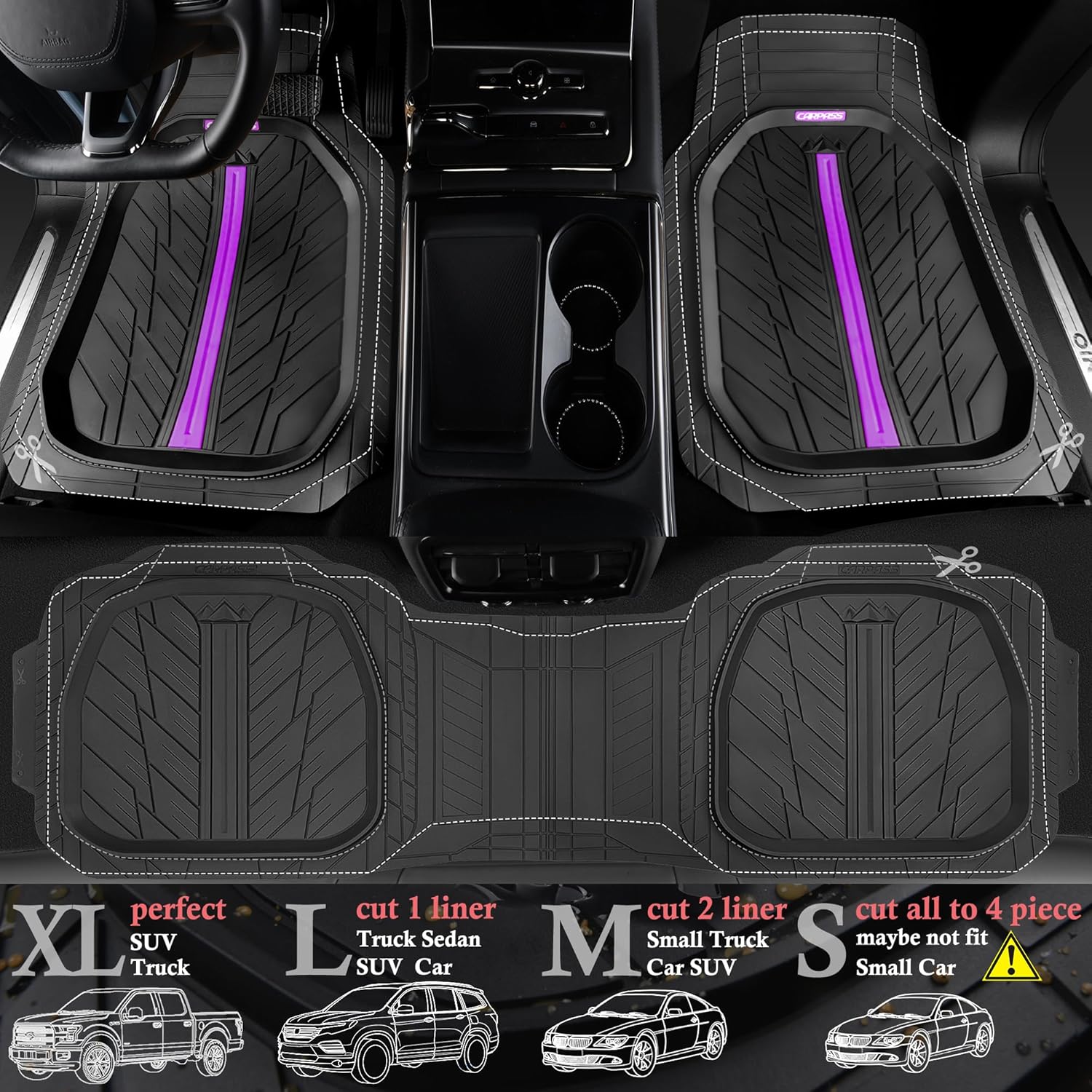 CAR PASS Tire Tread DeepDish Rubber Floor Mats for car Heavy Duty car mats All Weather, Universal XL~M Trim to Fit for Truck SUV Vehicle Automotive, Waterproof car mats 3 Piece (Purple Black)