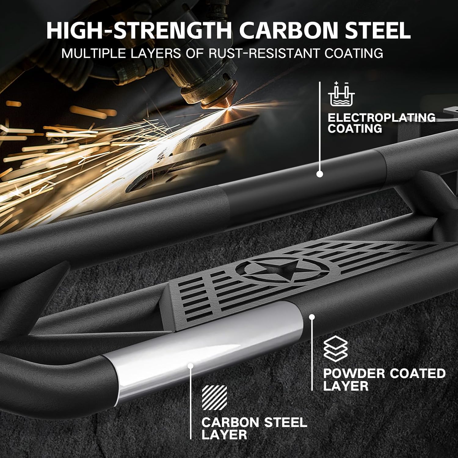 - ăStylish Designă: Featuring a step-style design with a drop height of approximately 5 inches. The rugged off-road look is complemented by a stylish design, enhancing the appearance of your wrangler JK.