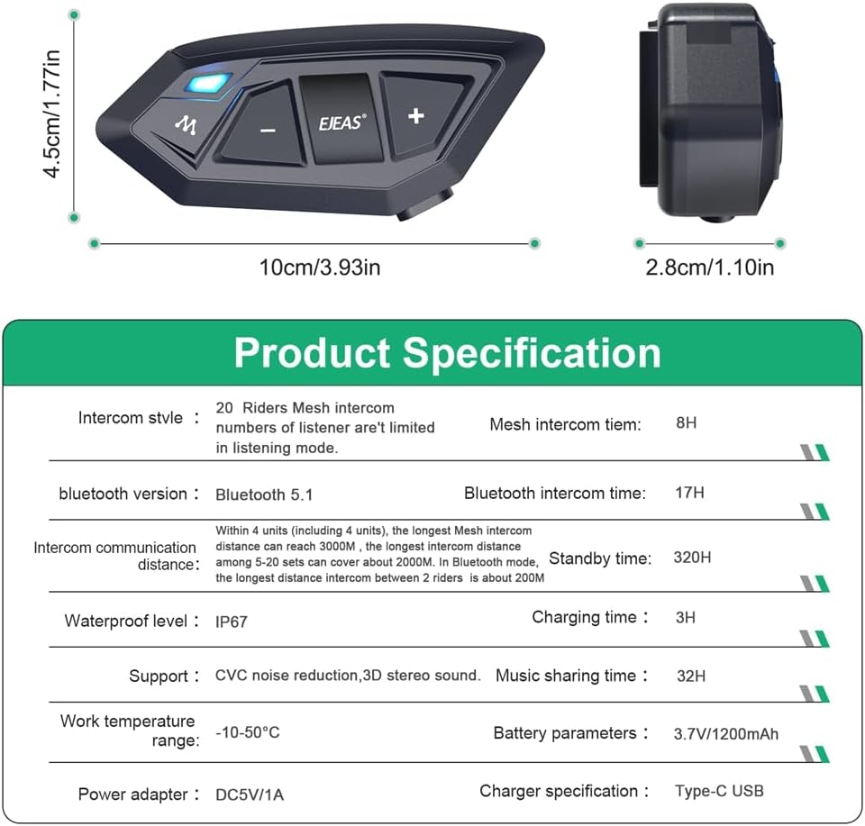 - 【Long Battery Life】MS20 motorcycle helmet intercom system is equipped with a 3.7V/1200mAh battery, a single charge of 3 hours can support up to 21 hours of Bluetooth intercom time, up to 8 hours of mesh intercom time and up to 320 hours of standby time.The universal TYPE-C interface is used for more convenient and stable charging.