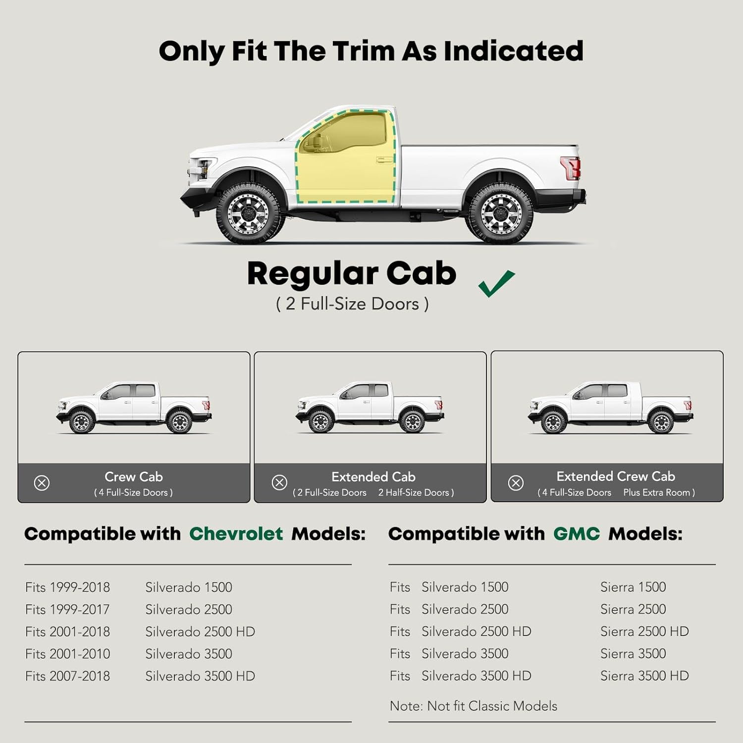 - Perfect Fit Side Bar: Our cab length running boards are fit for Chevrolet and GMC Models: Silverado/Sierra 1500 1999-2018, Silverado 2500 1999-2017, Sierra 2500 1999-2004, Silverado/Sierra 2500 HD 2001-2018, Silverado 3500 2001-2010, Sierra 3500 2002-2006, Silverado/Sierra 3500 HD 2007-2018---Standard Cab/Regular Cab (2 Front Doors); Excluding C/K Classic. YHTAUTO are committed to creating an all-around quality side bars that do more than just make it easy for you to get in and out of your car