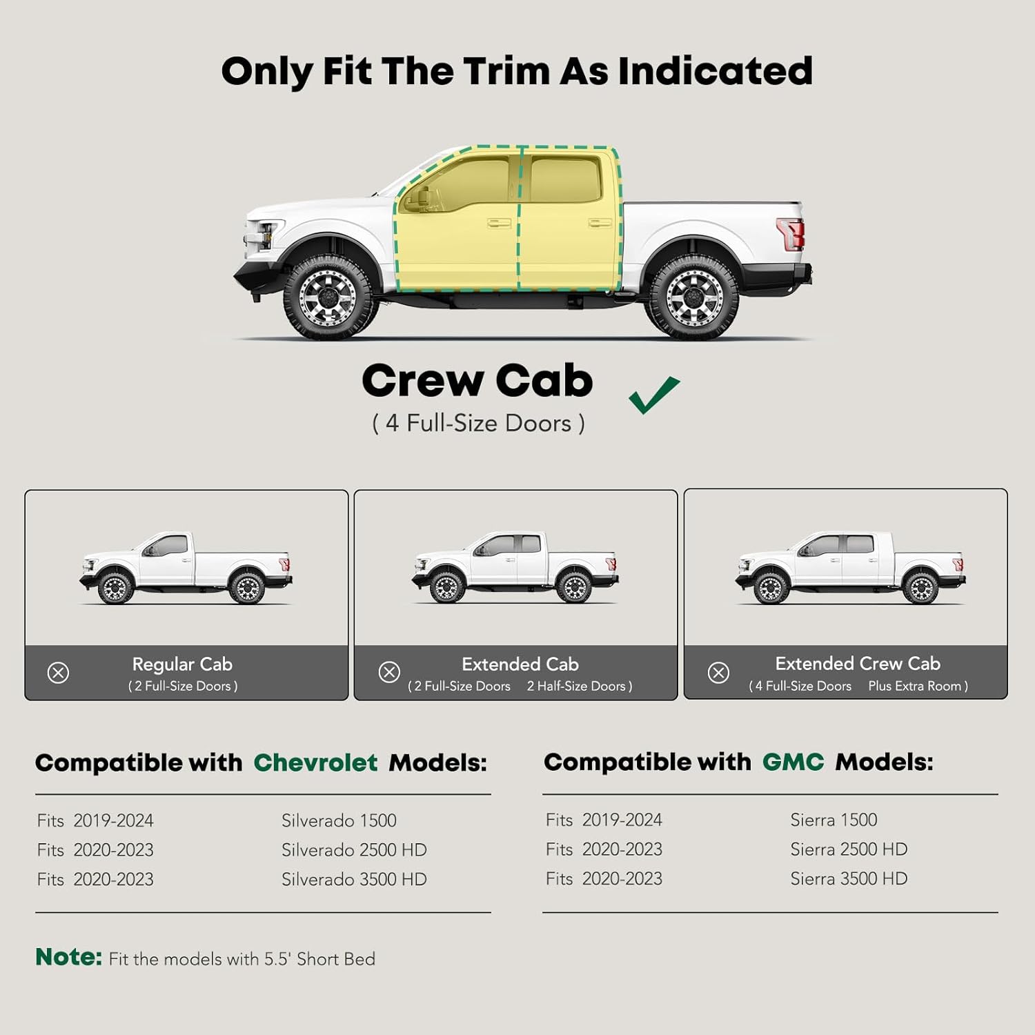 - Confident Fitment: Wheel-to-wheel side steps are compatible with the Chevrolet and GMC Models: Silverado/Sierra 1500 19-24, 2500 HD 20-24, 3500 HD 20-24, Crew Cab(4 Full-Size Doors). Our excellent sidebars are long-lasting and will enhance the appearance of your vehicle