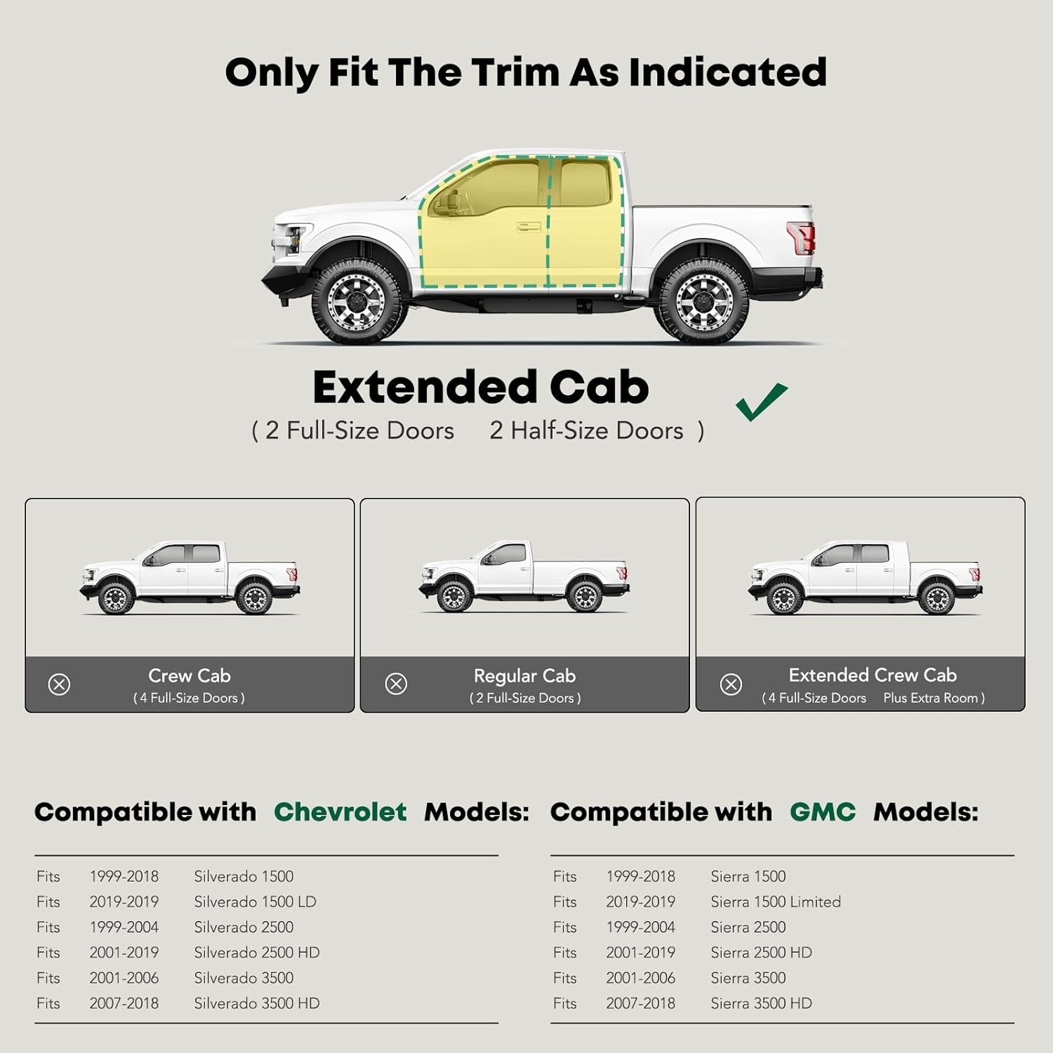 - Confident Fitment: Cab length side steps fits the Chevrolet GMC Models: Silverado/Sierra 1500 07-18, Silverado 1500 LD/Sierra 1500 Limited 19, Silverado/Sierra 2500 HD 07-19, Silverado/Sierra 3500 HD 07-18, Extended Cab/Double Cab(2 Full-Size Front Doors & 2 Narrower Rear Doors)only, not fit Crew Cab(4 Full-Size Door) or Standard Cab(2 Doors), Not fit Classic & C/K Models