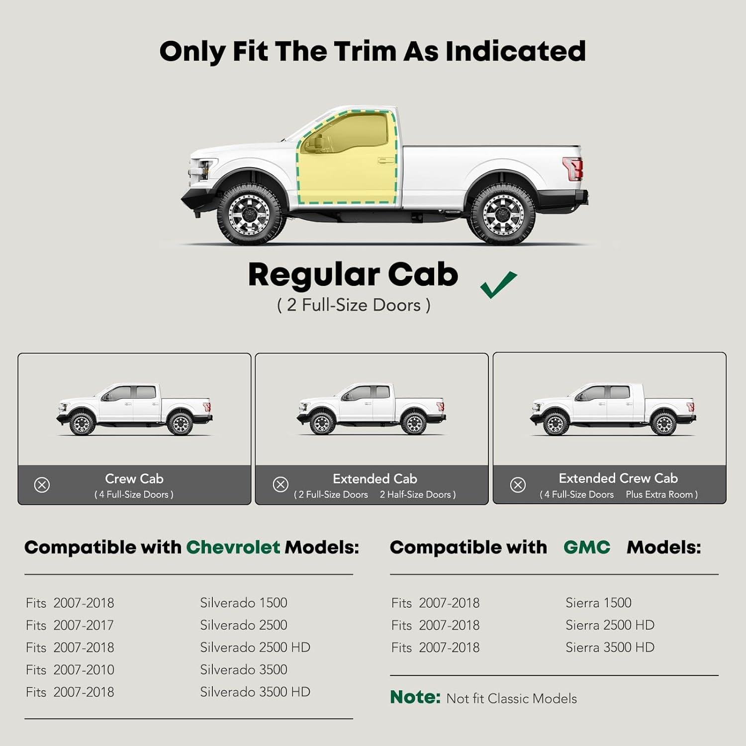 - Confident Fitment: Cab length running boards for Silverado are compatible with the Chevrolet and GMC Models: Silverado/Sierra 1500 2007-2018, 2500 HD 2007-2019, 3500 HD 2007-2018, Silverado 2500 2007-2018, Silverado 3500 2007-2010 --- It fits Standard/Regular Cab(2 Full-Size Doors),does not fit Crew/Extended/Extended Crew Cab; Excludes Diesel Def Tank Models, Not fit Classic Models