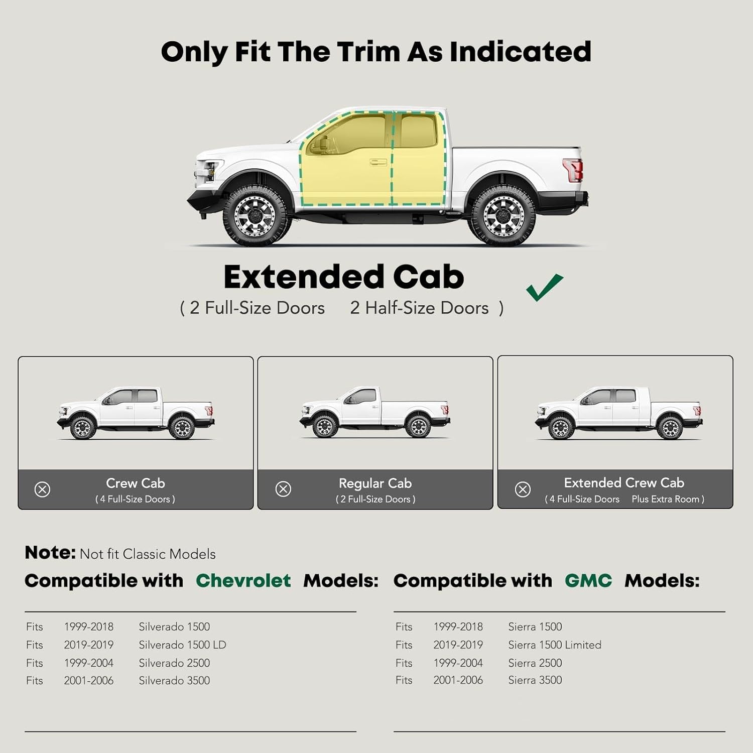 - Confident Fitment: Our side steps are compatible with Chevrolet and GMC Models: Silverado/Sierra 1500 1999-2018, Silverado 1500 LD/Sierra 1500 Limited 2019(Exclude SS), Silverado/Sierra 2500 1999-2004, Silverado/Sierra 3500 2001-2006---Extended Cab/ Double Cab Pickup (2 Full Size Doors & 2 Narrow Doors), not fit Crew Cab(4 Full-Size Door) or Standard Cab(2 Doors); Excluding C/K Classic