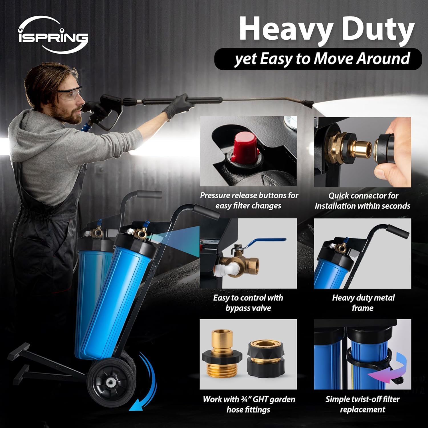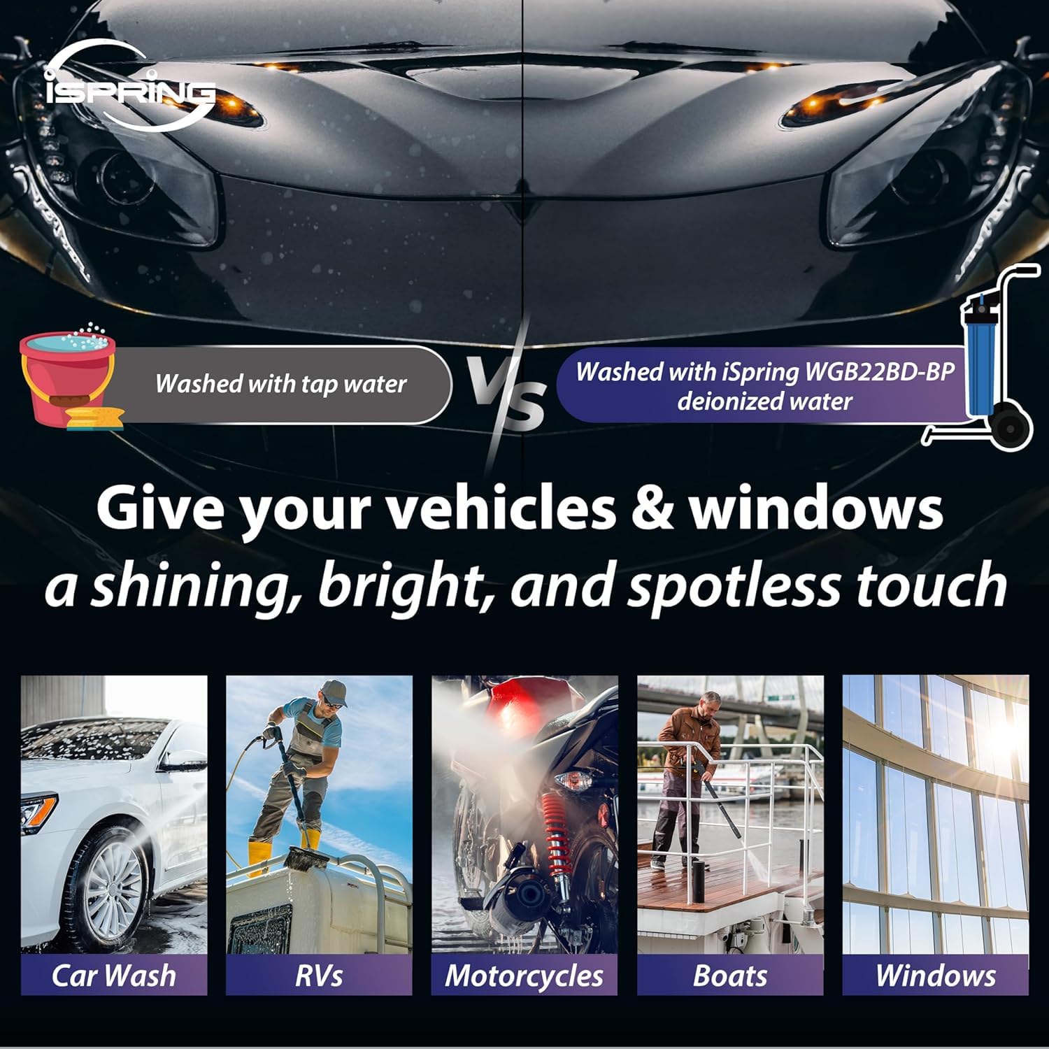 - đźš— Advanced Car Wash Solution: Experience a pristine car wash system that delivers filtered water with minimal to zero Total Dissolved Solids (TDS). The iSpring new WGB22BD-BP deionized water system is ideal for giving cars, RVs, boats, motorcycles, windows, and more a brilliant, spotless finish.