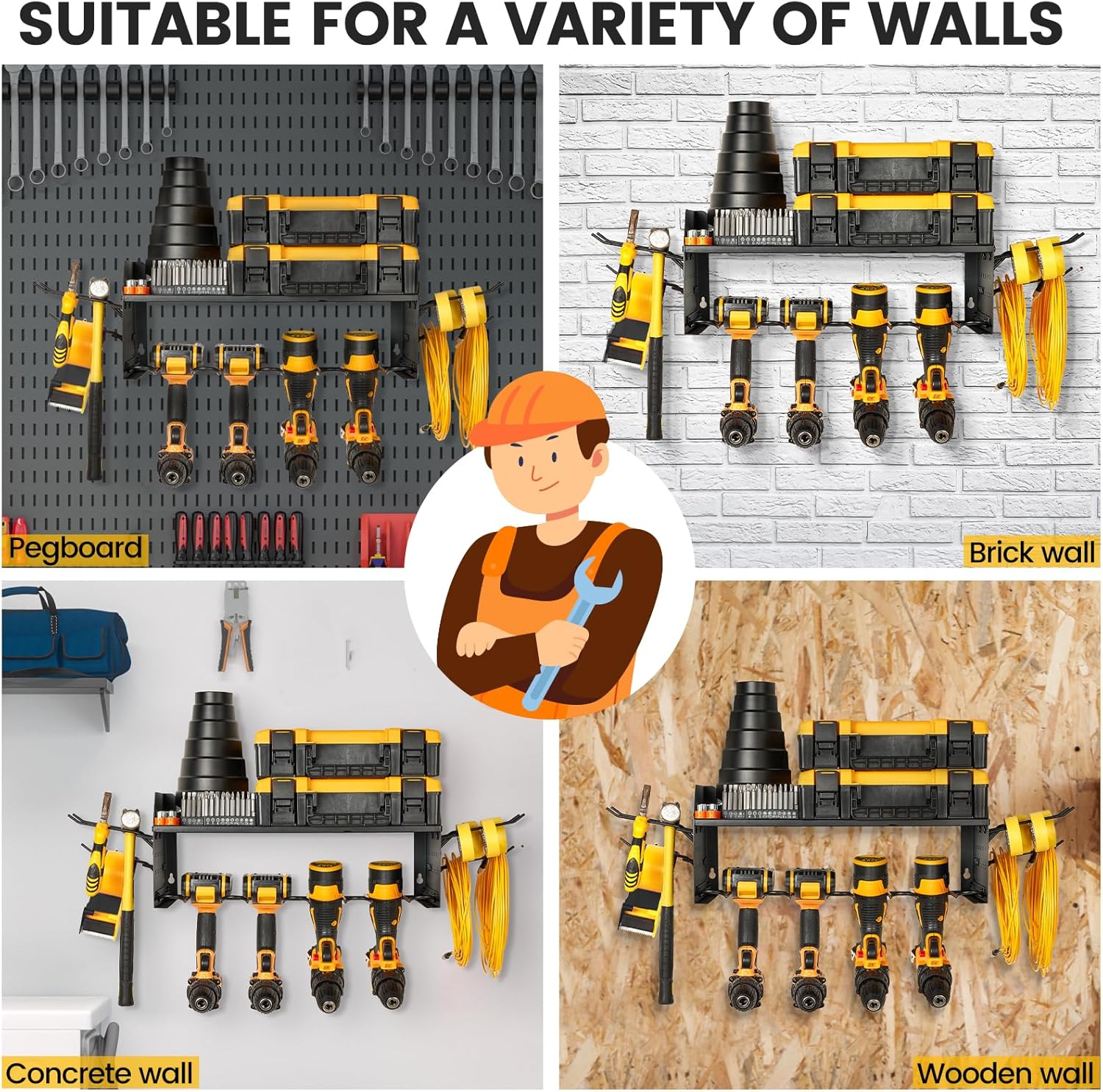 TRZZ Power Tool Organizer Wall Mount, 2-Tier Cordless Drill Rack with 4 Drill Holders and 2 Side Pegboards, Efficient Drill Storage for Garage, Tool Room, and Workshop (Black)