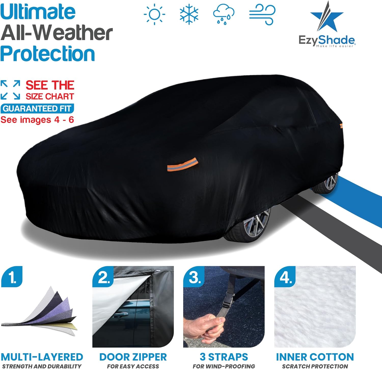 - ADVANCED MATERIAL TECHNOLOGY. EzyShade car covers are advanced in design and quality. The cover’s heavy duty yet lightweight materials are machine cut, multi-layered and bond-pressed for optimal weather proofing, paint protection, and enhanced durability.