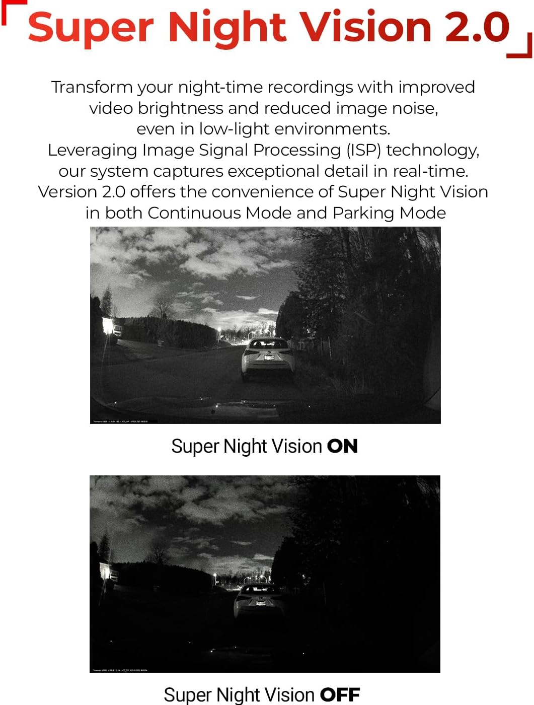 - ăSUPER NIGHT VISION 2.0ă Enhances video brightness and reduces image noise in low-light conditions, so you donât miss important details while driving and parked.
