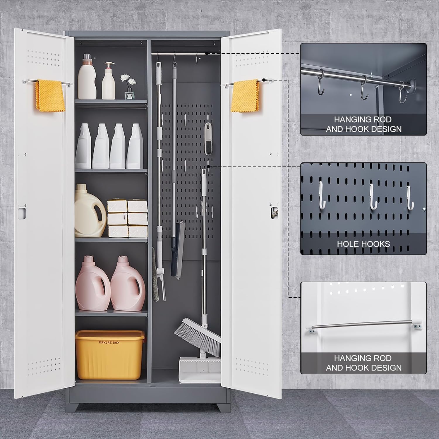 - ăVersatile UseăThis cleaning metal storage cabinet comes with multiple accessories to meet your needs. Adjustable shelves accommodate items of varying heights. The right side is equipped with a hanging rod and S-hooks, and the hanging rod on the door can be used for towels and other items. The perforated panel design makes it easy to store and retrieve tools, keeping the space tidy and organized. The cabinet can store documents, brooms, mops, tools, towels, clothes, and more.