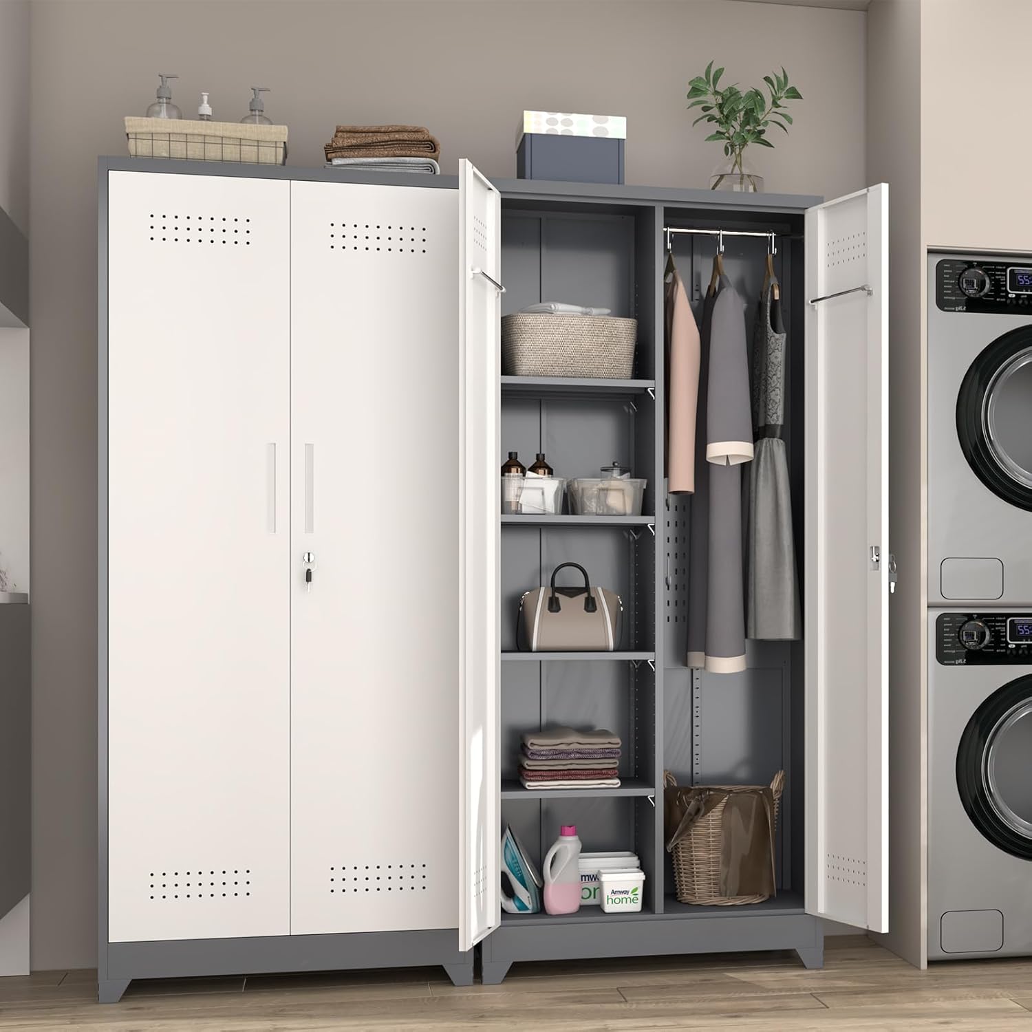 GREATMEET 72.8" Broom Storage Cabinet, Utility Cabinets for Brooms and Mops, Metal Storage Cabinets for Cleaning Supplies, Utility Closet for Garage, Grey&White