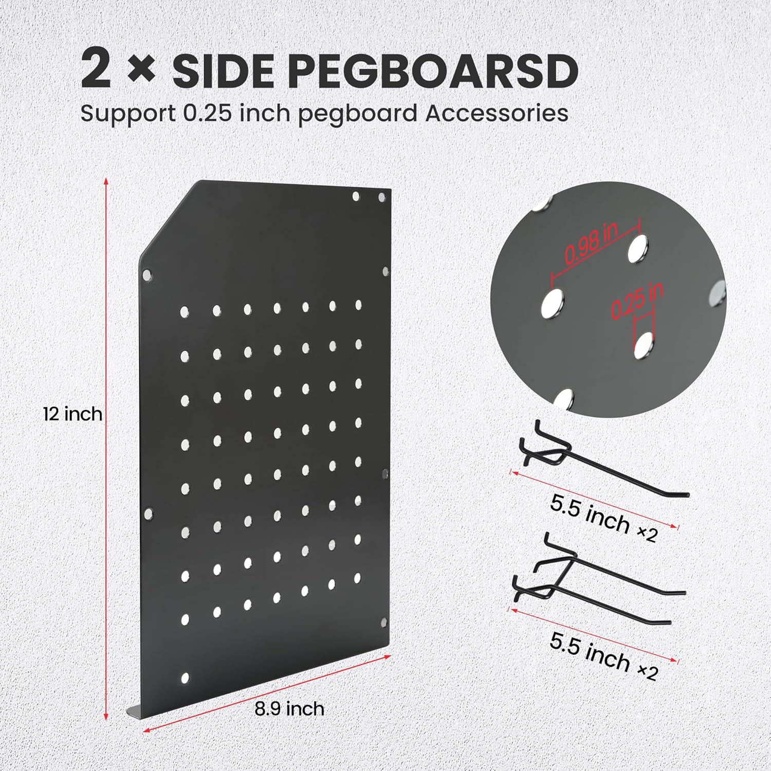 - Versatile Side Pegboards: Hang garage tools on 8.9"W Ă— 12"L side pegboards with included long hooks, drill bit rack, and cordless rack, supports 0.25" pegboard organizer accessories for DIY customization