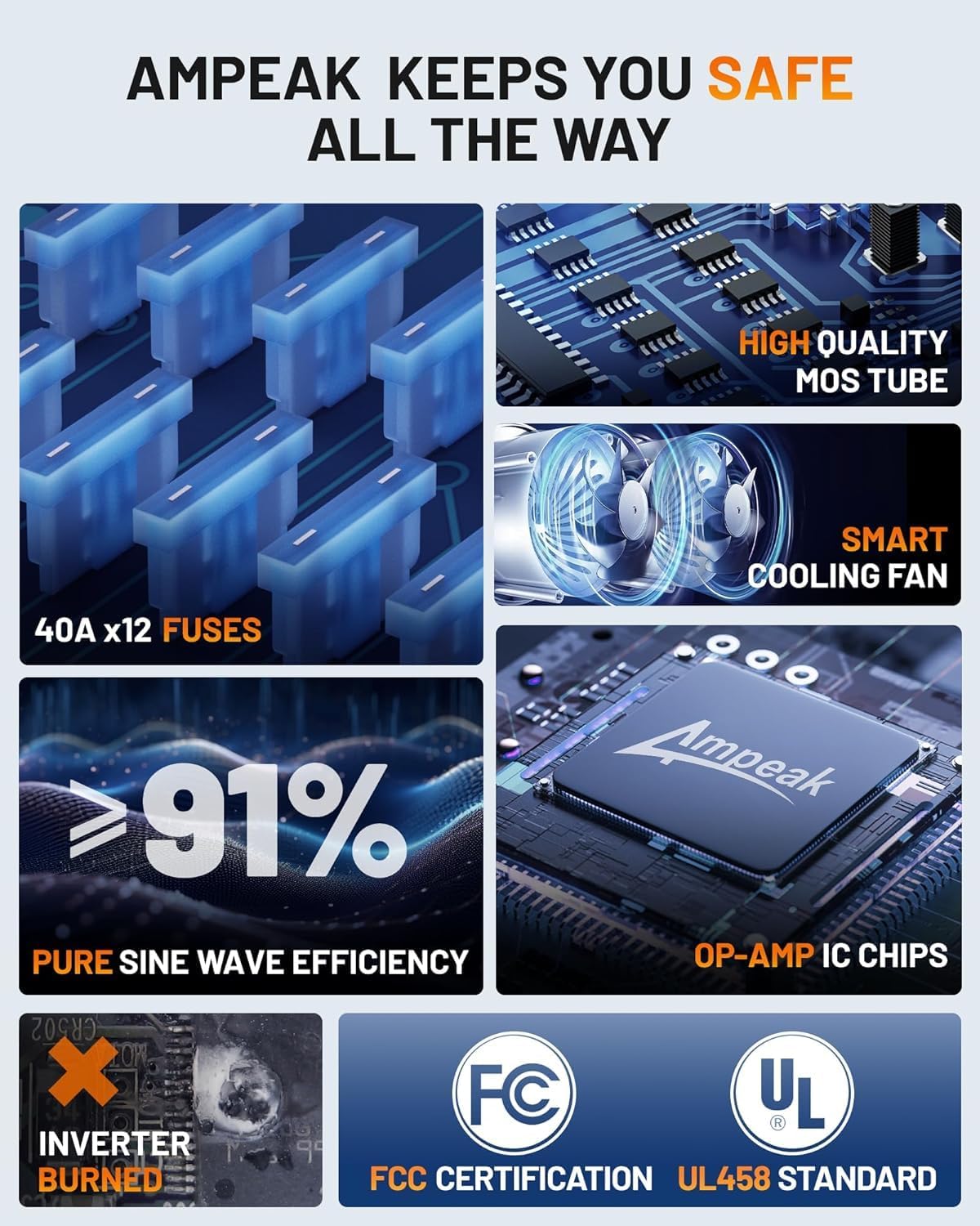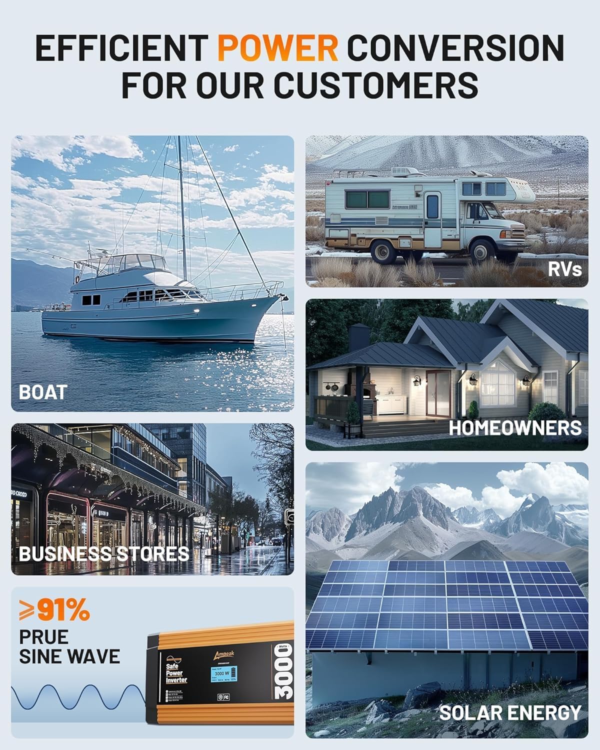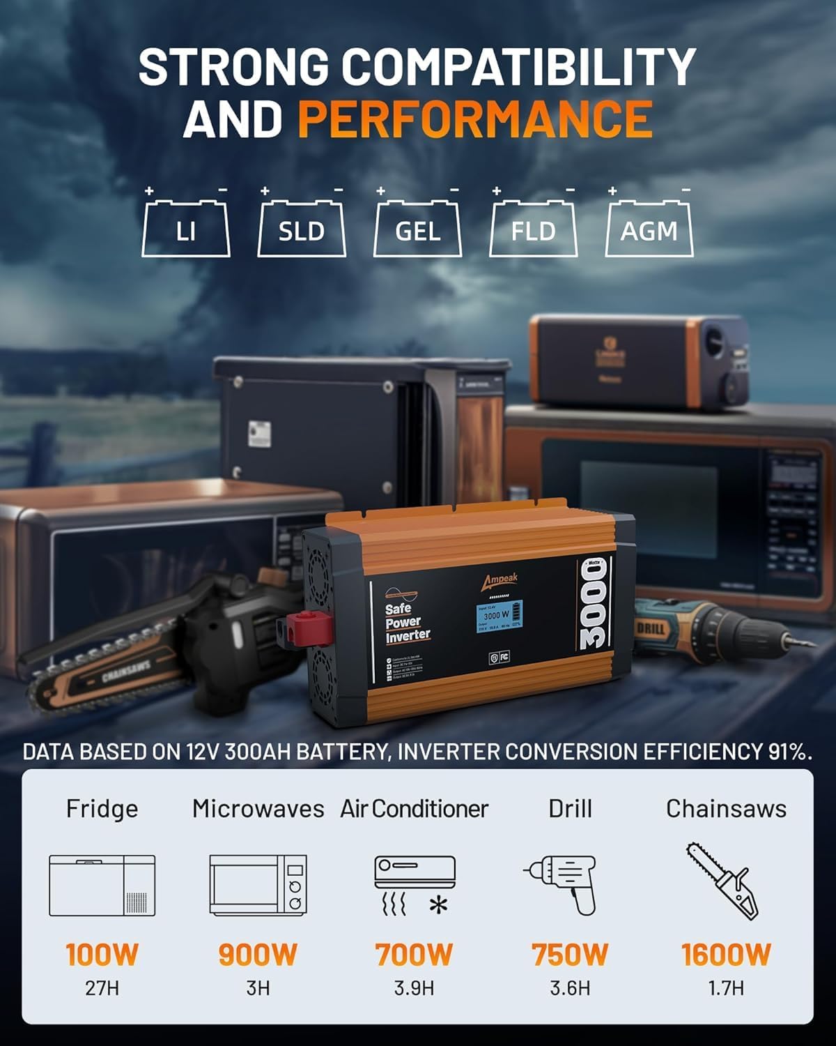 - 【All-Environment Ready】Ampeak 3000 watt pure sine wave power inverter support off-grid solar system with 90% efficiency, 24/7 operation. Includes 3ft cables, 18-month warranty, and 24/7 support.Perfect for off-grid homes, hurricanes, and van life.