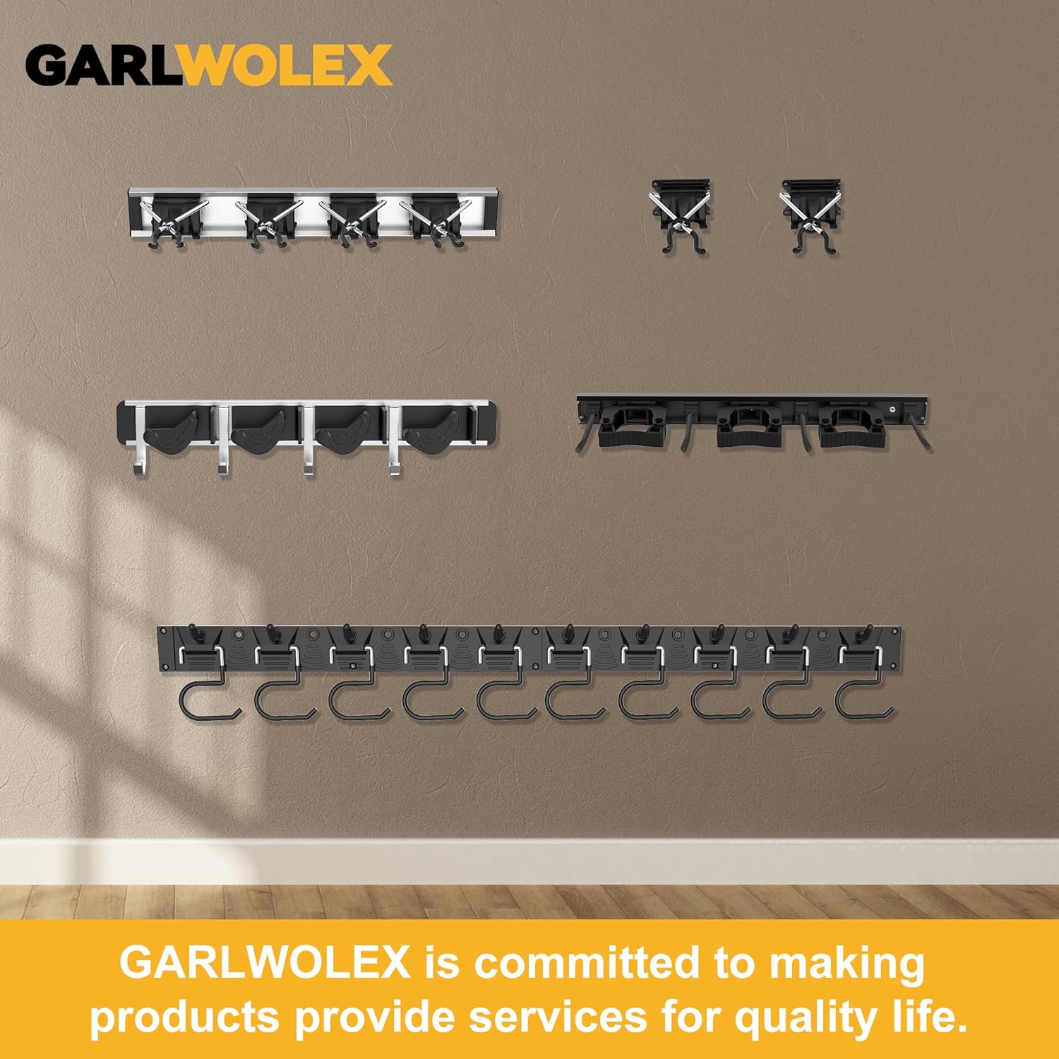 - Secure, No-Slip Design: Equipped with 4 spring-loaded slots with rubber grips, this holder ensures that tools are securely locked in place. The 4 hooks can support a total weight of up to 40 pounds, making it ideal for everything from brooms and mops to gardening and hardware tools.