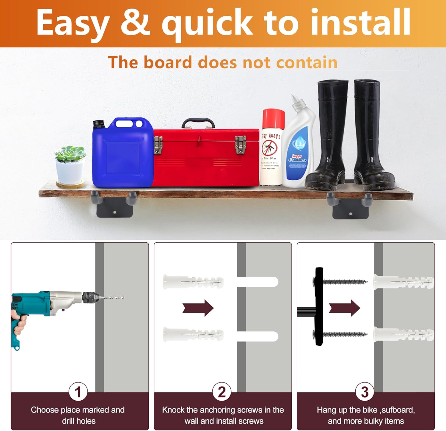 - Extra long 14 inches garage hooks:Heavy duty double hook design better than single hook, double hook design provides more options, such as chairs, strollers, power tools snowboards, snowboards, shovels, rakes, axes, large garden tools. To store excess garage or workshop items such as lumber, paint, and tools, all you need is an arm's length 14 Inches shelf to be a handy pantry organizer and create storage shelves above your workbench.