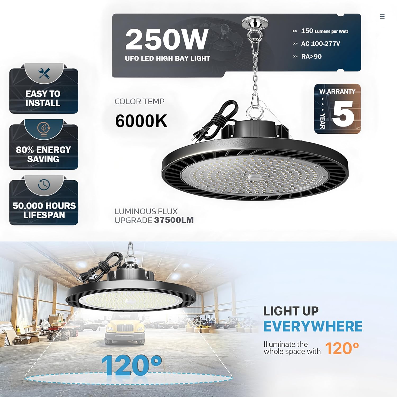 - ✔️【Led High bay Light 250W details】It features LED technology top quality diodes that total 30000 lumens,CRI80+,250W, 6000K daylight for your garage, warehouse,providing the best indoor lighting experience.