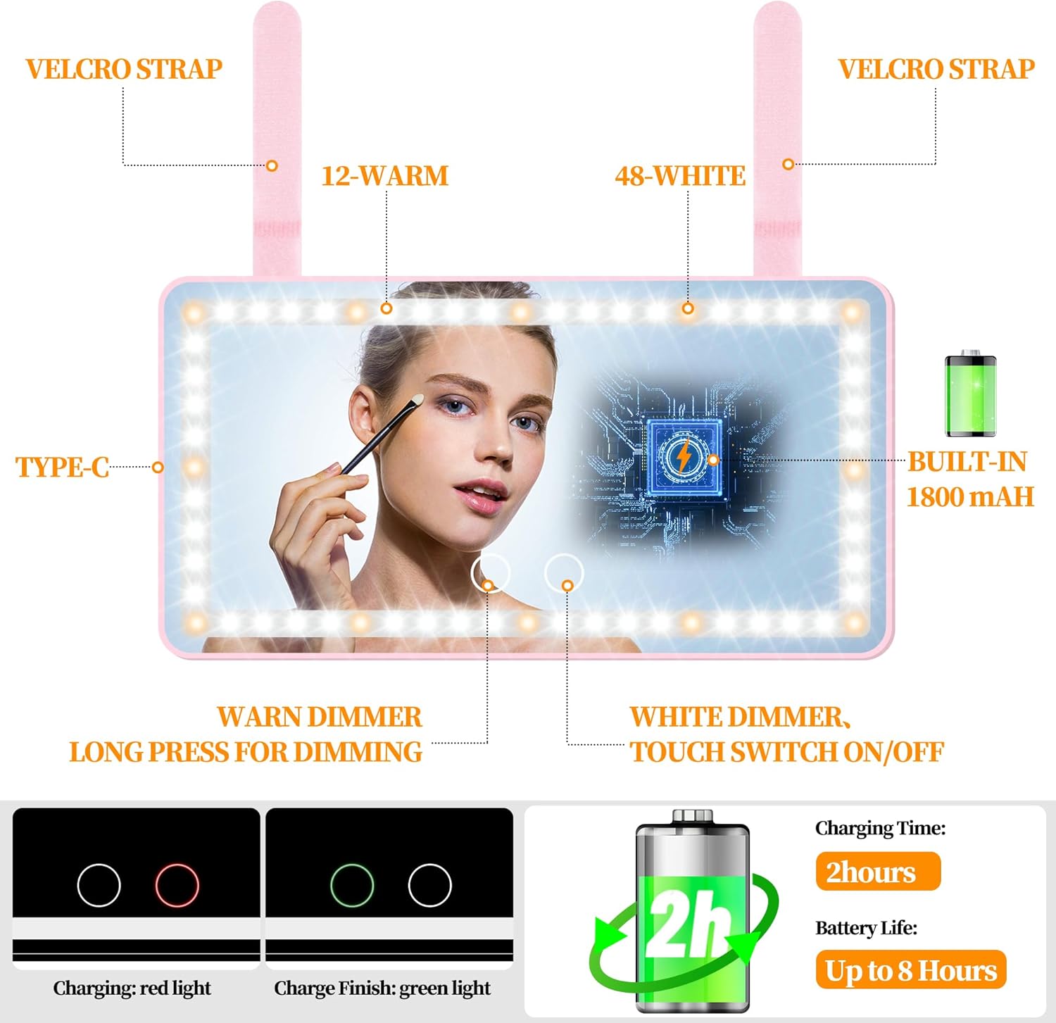 - DIMMABLE BICOLOR LED LIGHTS: The car makeup mirror has 12 yellow lights and 48 white lights, which is 40% brighter and 60% less energy than normal bulbs. Short press the 2 sensor switches to replace 3 light colors: white, yellow, white and yellow. Long press for dimming according to what you need. 2500-6500K color temperature is equivalent to outdoor sunlight, the makeup is naturally no difference